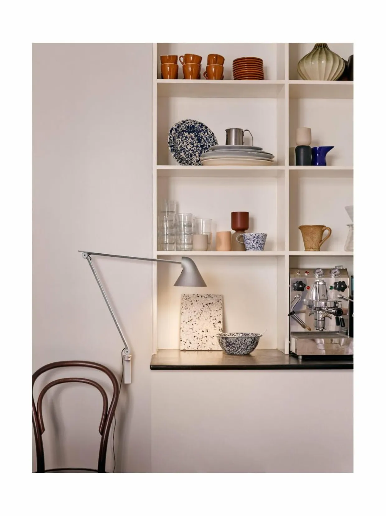 Nendo-designstudion Louis Poulsenille suunnittelema NJP edustaa minimalistista ja funktionaalista suunnittelua. Seinään asennettava LED-valaisin tuottaa suoraa häikäisemätöntä vaakavaloa, josta osa heijastuu kuvun takaosan kautta varren yläosaan. Varren nivelten avulla valo on helppo ohjata haluttuun kulmaan työpöydän tai lukunurkkauksen ylle. Pinta on pulverimaalattu.