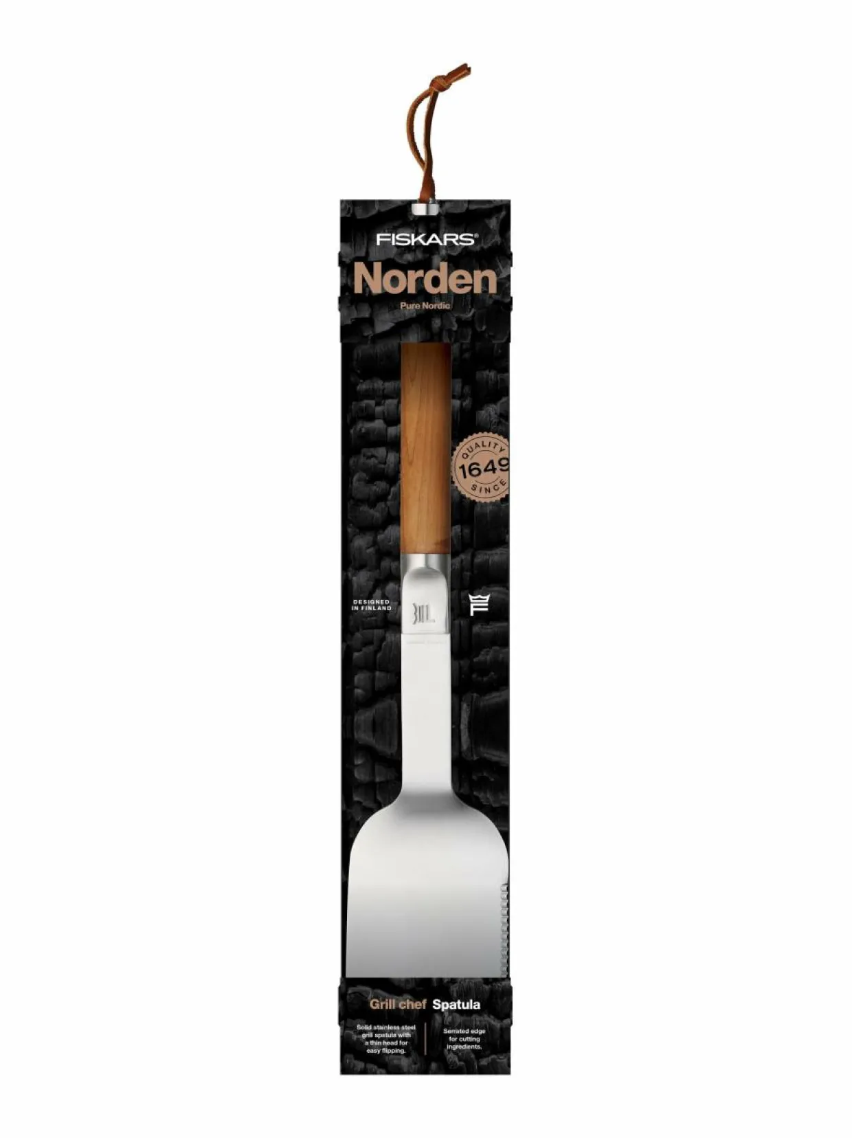 Pitkästä käsityöperinnöstä syntyneet ja tiukasti pohjoiseen maaperään juurtuneet Fiskars Norden -grillivälineet on suunniteltu ensiluokkaiseen, perinteiseen ulkoruokailukokemukseen. Norden Grill -lasta on valmistettu korkealaatuisista materiaaleista kauniin toimivuuden ja pitkäikäisyyden takaamiseksi. Sen tukeva ruostumattomasta teräksestä valmistettu pää kääntää ruoan helposti ja siinä on sahalaitainen leikkuureuna. Sen ainutlaatuinen kahva on valmistettu lämpökäsitellystä koivusta, joka on peräisin vastuullisesti hoidetuista metsistä, ja siinä on kätevä säilytyslenkki. Suunniteltu Suomessa.