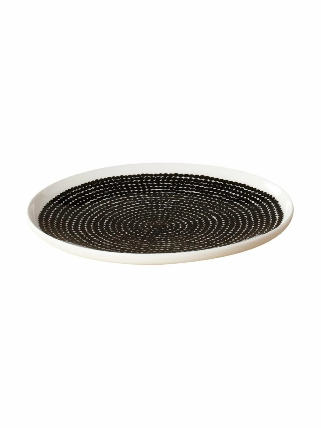 Kivitavarasta valmistettua Oiva-lautasta koristaa Maija Louekarin suunnittelema Räsymatto-kuosi. Lautanen kestää konepesun, mikroaaltouunin sekä pakastamisen.