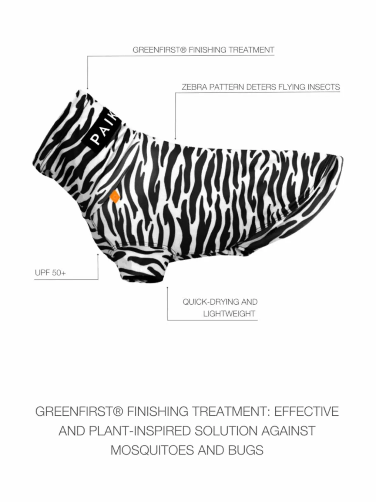 PAIKKA UV & Bug Shirt on suunniteltu suojaamaan koiraasi. GREENFIRST®-käsittely pitää hyttyset ja muut inhottavat ötökät loitolla, ja seeprakuosi luo optisen harhan, joka auttaa karkottamaan lentäviä hyönteisiä. Kankaassa on UV-suojaus, joka estää haitallisten UV-säteiden vaikutuksia. Nopeasti kuivuva ja kevyt materiaali mahdollistaa vapaan liikkumisen kaikissa kesän seikkailuissa.