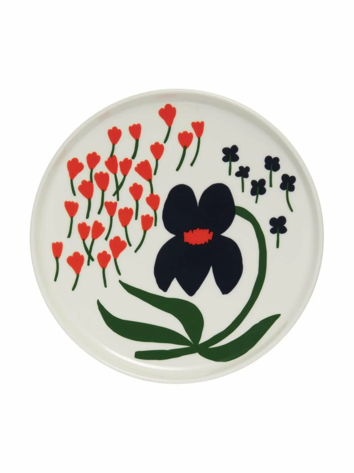 Marimekon Palsta-lautasta koristaa kukkakuvio rohkealla väriyhdistelmällä. Suunnittelija Lotta Maija on ammentanut inspiraatiota Palstan energiseen kuvioon kesämökin kukkapenkkien kasveista. Lautanen on 100 % keramiikkaa ja sen halkaisija on 20 cm.
