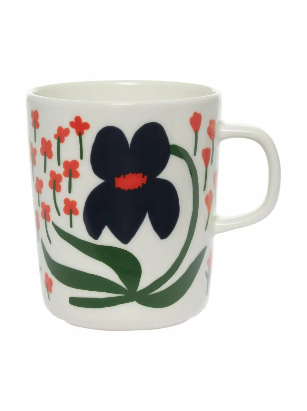 Marimekon Palsta-mukin vaalea pohjasävy on koristeltu kauniilla kukkakuosilla. Sen vetoisuus on 2,5 dl. Muki on valmistettu kestävästä konepesun kestävästä keramiikasta.