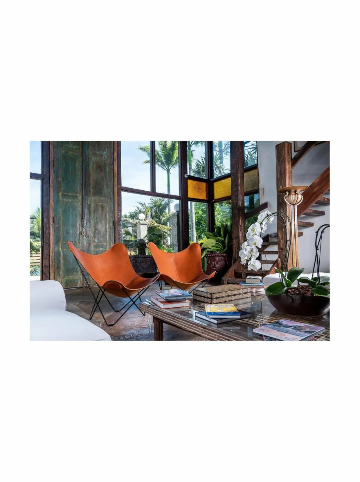 Cueron klassinen Pampa Mariposa -lepakkotuoli henkii 50-luvun muotokieltä. 12 mm vahvaan teräsrunkoon kiinnitettävä verhoilu on kasviparkittua italialaista satulanahkaa. Mukana tulevat lattiasuojat.