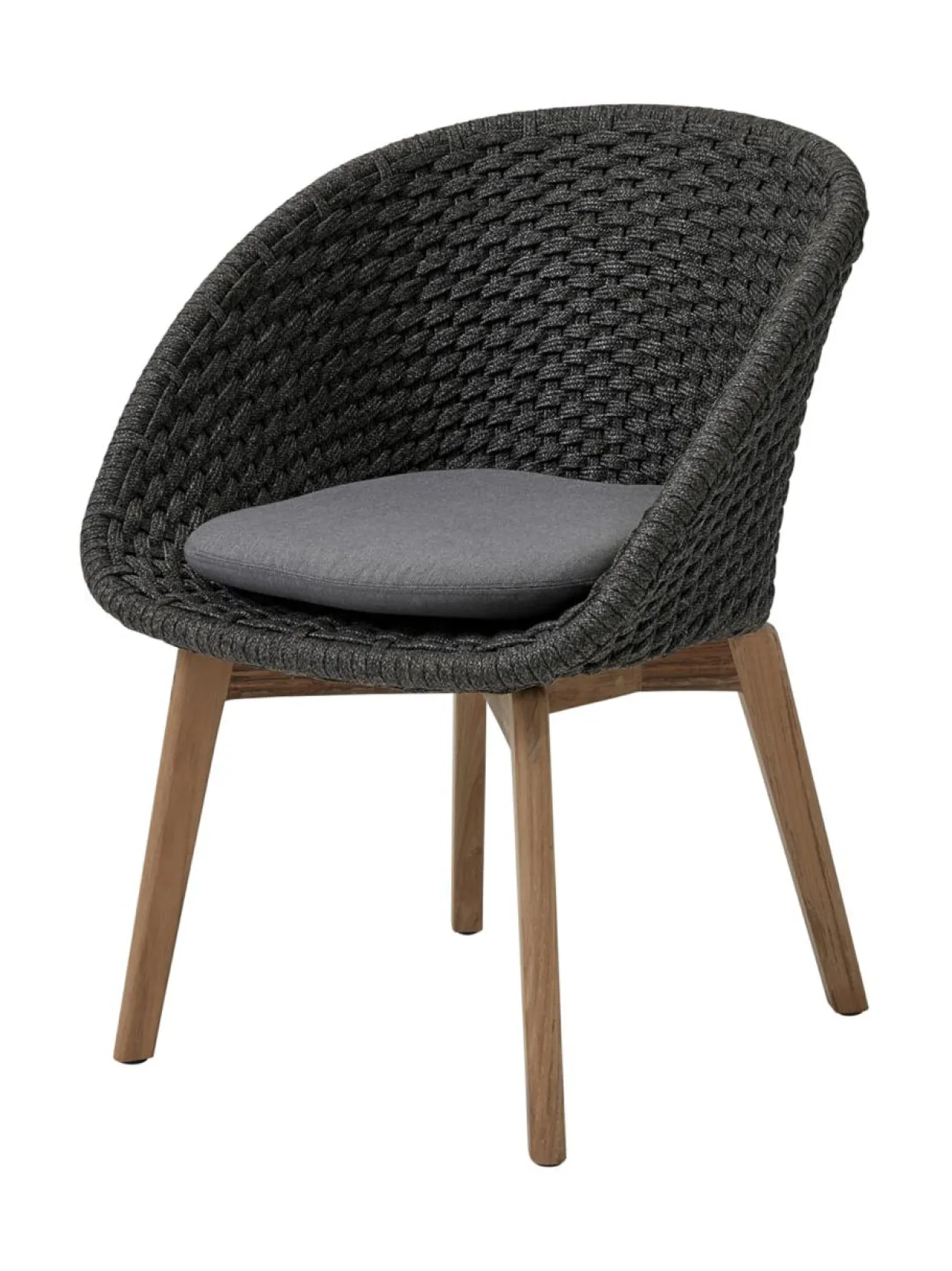 Peacock-tuoli ulkokäyttöön. 61 cm lev, 61 syv, 81 kork, 47 istuinkork. Istuintyyny sisältyy hintaan, harmaa Cane-line Natté. Teak runko, tumma harmaa Cane-line Soft Rope -punos.