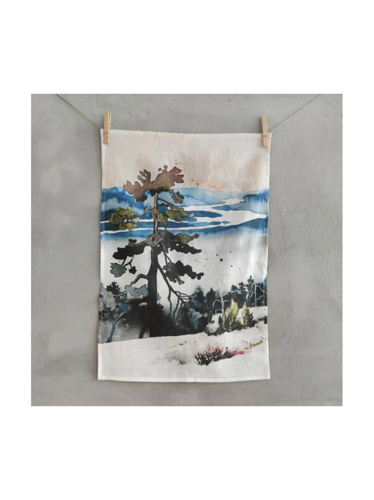 Pyyhe on 100% pellavaa, ja sen hyvä imukyky sekä nopea kuivuminen ovat kullanarvoisia ominaisuuksia käytössä. Kuva on suunniteltu niin, että se näkyy kokonaan myös silloin, jos laitat pyyhkeen kaksinkerroin roikkumaan tangon päälle. Ripustusnauha on sekä tuotteen pitkällä että lyhyellä sivulla.
