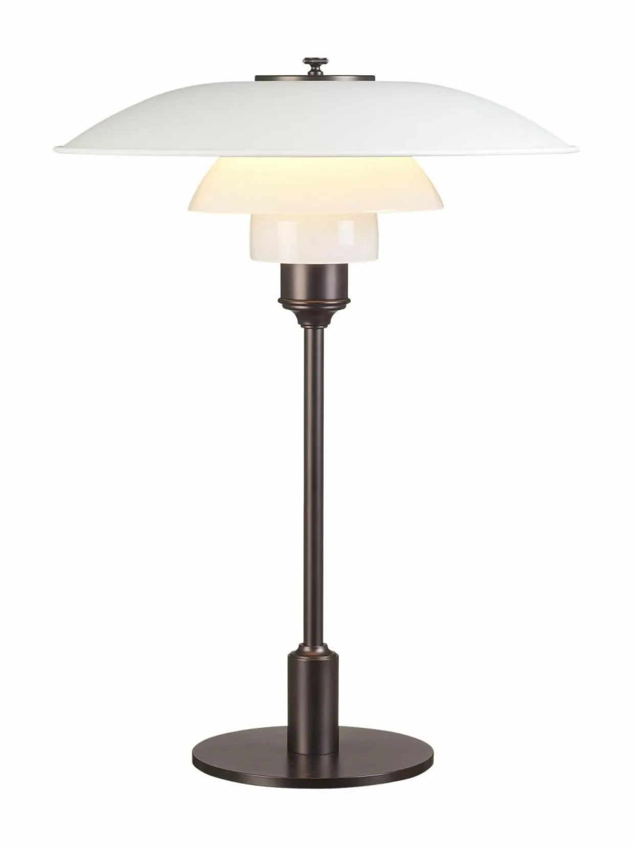 Modernin nostalginen PH 3½-2½ -pöytävalaisin tuottaa häikäisemätöntä ja taloudellista valoa. Poul Henningsenin muotoilemassa valaisimessa on kolme varjostinta, joiden muotoilu perustuu logaritmiseen spiraaliin. Metallisen ylävarjostimen valkoinen alapinta heijastaa valoa pehmeästi alaspäin samalla kun valkoisesta suupuhalletusta opaalilasista valmistetut alavarjostimet heijastavat valon pehmeästi huonetilaan. Valaisimen jalusta on lakattua messinkiä. Varjostimen halkaisija on 33 cm ja korkeus 45 cm.