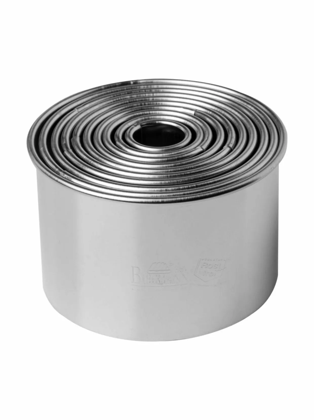Pakkauksessa on 10 erikokoista, pyöreää pikkuleipämuottia. Muottien halkaisija on 1,5-7 cm ja korkeus 4,5 cm. Materiaali on ruostumatonta terästä.