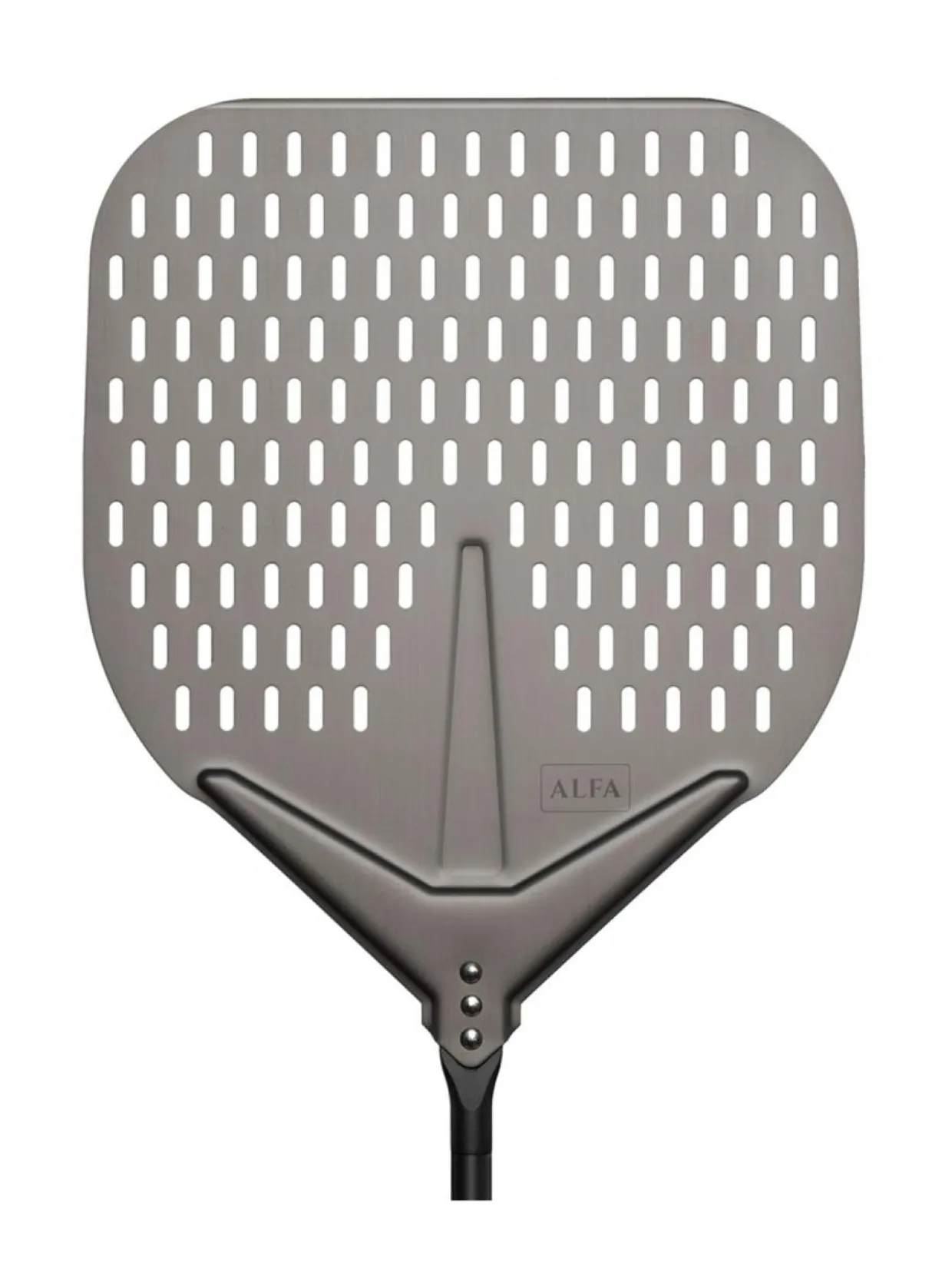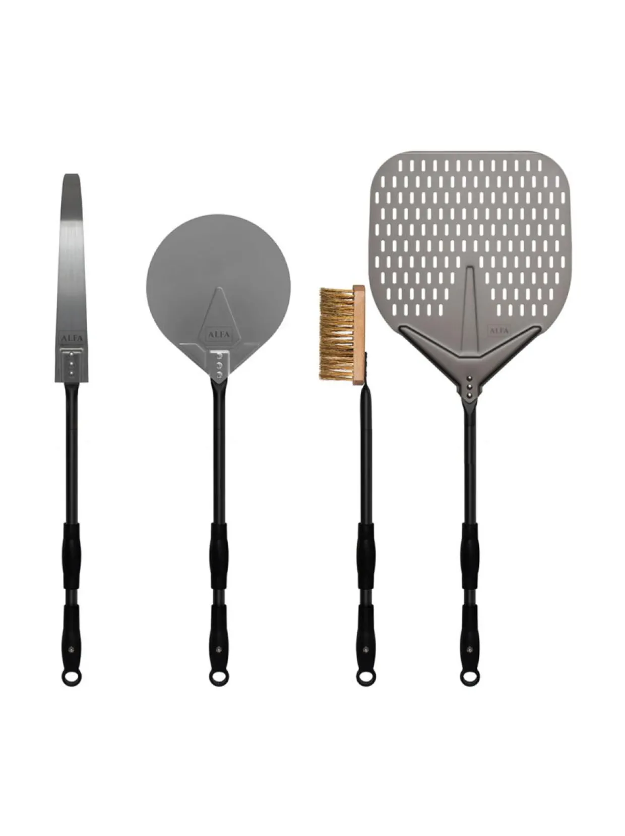 – Pizzalapio: pizzan uuniin asettamiseen tarkoitettu lapio, jossa on jatkettava alumiininen varsi ja liukas alumiininen rei’itetty lapio-osa. Putkimainen ja ammattimainen kahva helpottavat pizzan käsittelyä sekä uuniin laittamista. Pyöristetyn reunan ansiosta pizzan asettaminen uuniin on helppoa.