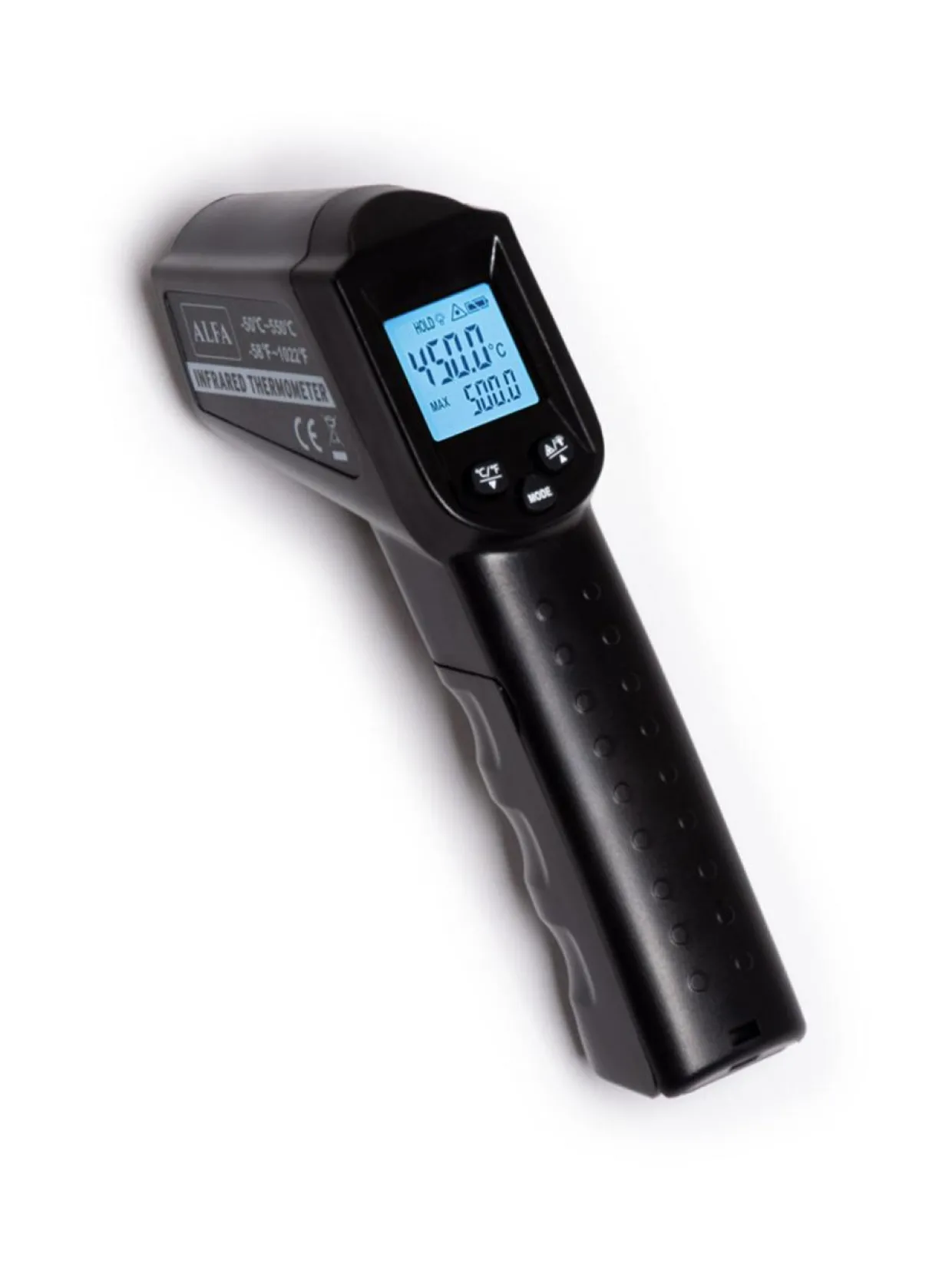– Infrapunamittarin avulla voit hetkessä tarkistaa uunin pohjan lämpötilan paistaaksesi pizzan oikeaan aikaan. Max. mittauslämpötila n. 550°C