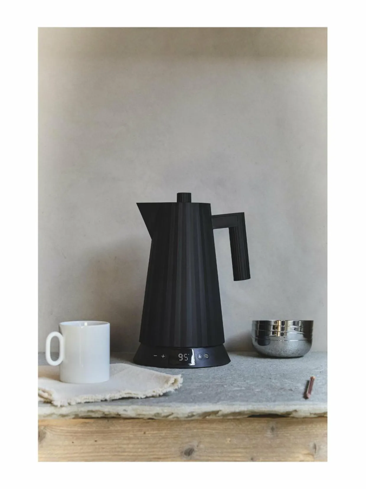 Michele De Lucchin suunnittelemassa, termoplastisesta hartsista valmistetussa Plissé-vedenkeittimessä yhdistyvät toiminnalliset näkökohdat kiehtovaan muotoiluun, joka paljastaa luojan arkkitehtonisen taustan sekä hänen intohimonsa käsityöhön ja kuvanveistoon. Tämä vedenkeitin on muotisuunnittelijan muotoilema kaunis esine, jonka voi jättää huoletta näkyvälle paikalle keittiössä. Vedenkeittimessä on kaunis sävy. Lämpötilan voi säätää itse. Kiehumisen jälkeen kuuluu merkkiääni, joka osoittaa, että oikea lämpötila on saavutettu. Keittimessä on kuivakiehumissuoja, eristetty pinta ja irrotettava pohja.
