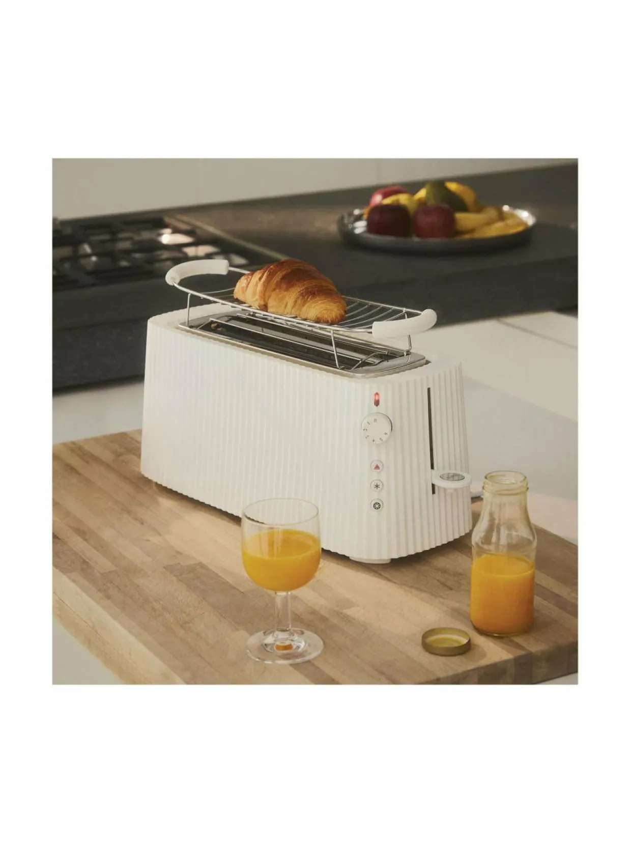 Alessin Plissé-leivänpaahtimen muotokieleen on haettu inspiraatiota muotimaailmasta ja arkkitehtuurista. Michele De Lucchin suunnittelema leivänpaahdin toimii mainiosti myös sisustuselementtinä. Voit valita leivän paahtoasteen kuudesta eri vaihtoehdosta. Leivänpaahtimessa on myös sulatustoiminto jäiselle leivälle sekä uudelleenlämmitystoiminto, joka lämmittää jäähtyneen leipäpalan haluttuun lämpötilaan 30 sekunnissa. Irrotettava murualusta tekee paahtimen puhdistamisesta helppoa, ja liukumaton pohja takaa, että laite pysyy käytön ajan tukevasti paikallaan.