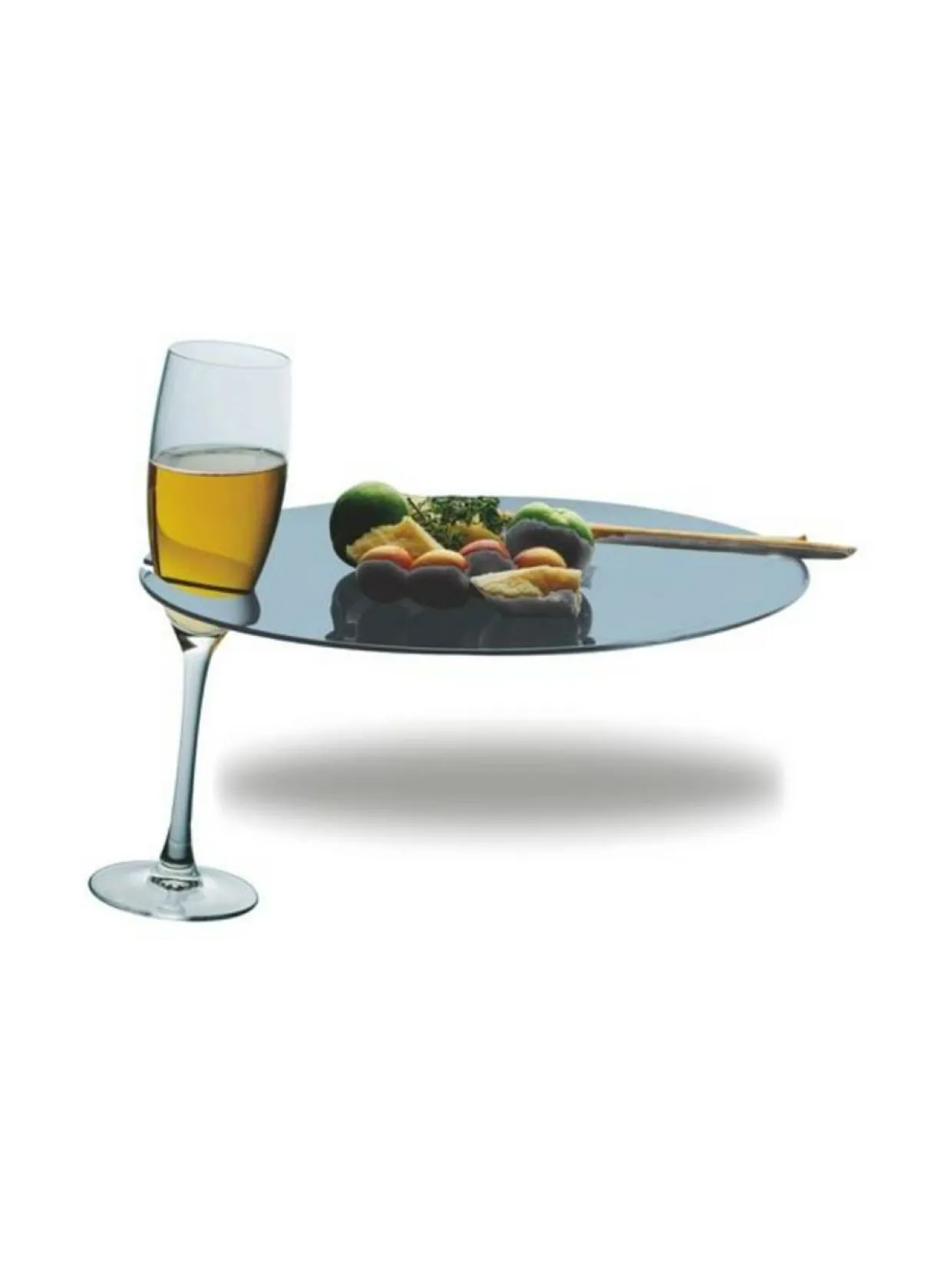 Policarbonato-buffettilautasen halkaisija on 27 cm ja siinä on pidike jalalliselle viini-tai shamppanjalasille.Tuotenumero761883 VäriSAPHIR