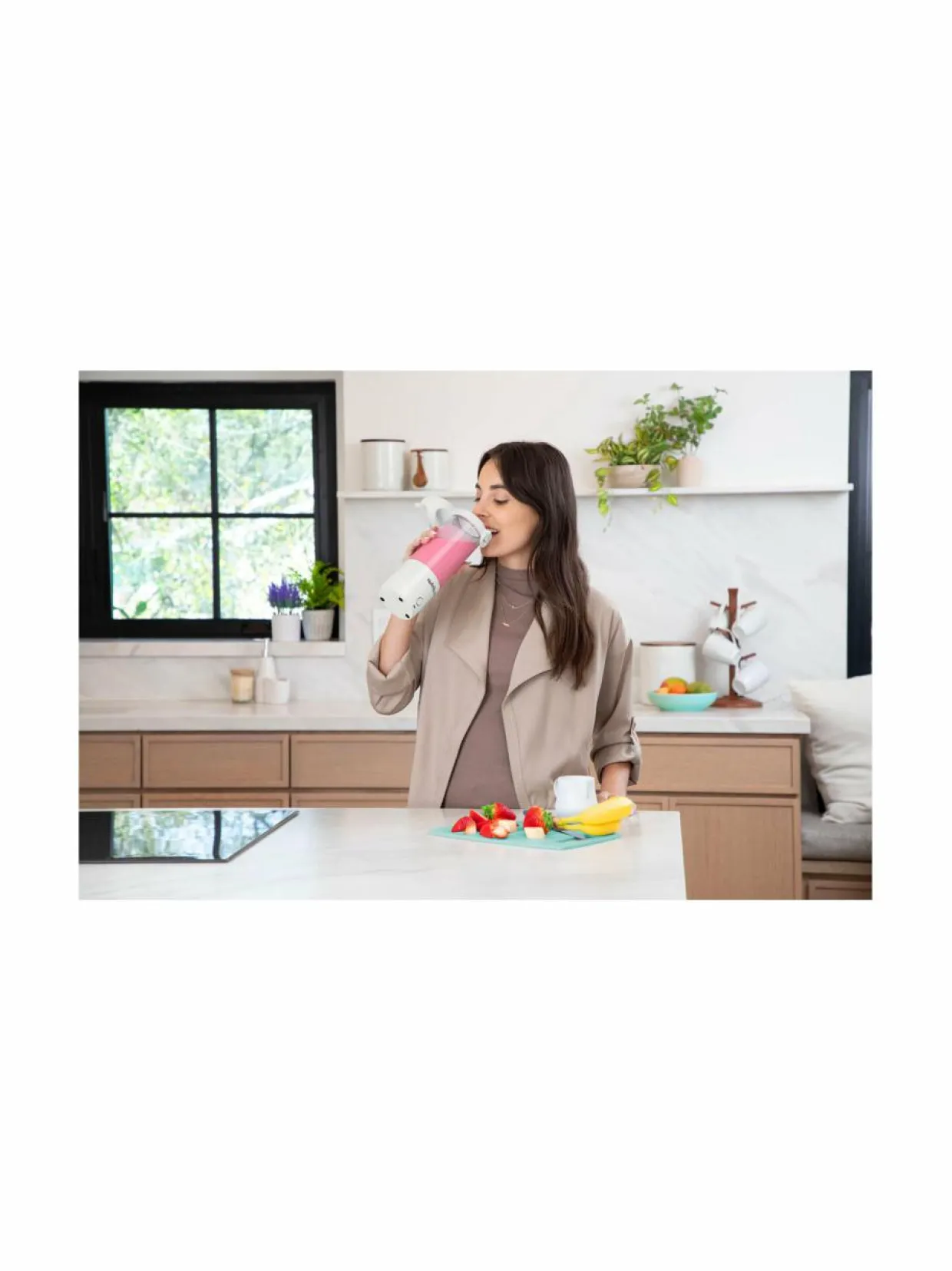 Nelisakarainen ruostumattomasta teräksestä valmistettu terä murskaa pakastetut hedelmät, jäät, vihannekset, marjat tai pähkinät helposti nautittavaksi vitamiinipommiksi ongelmitta ja kestävä 475 ml Tritan-muki soveltuu erinomaisesti sekä sekoittamiseen että juomiseen – ilman sotkuja.