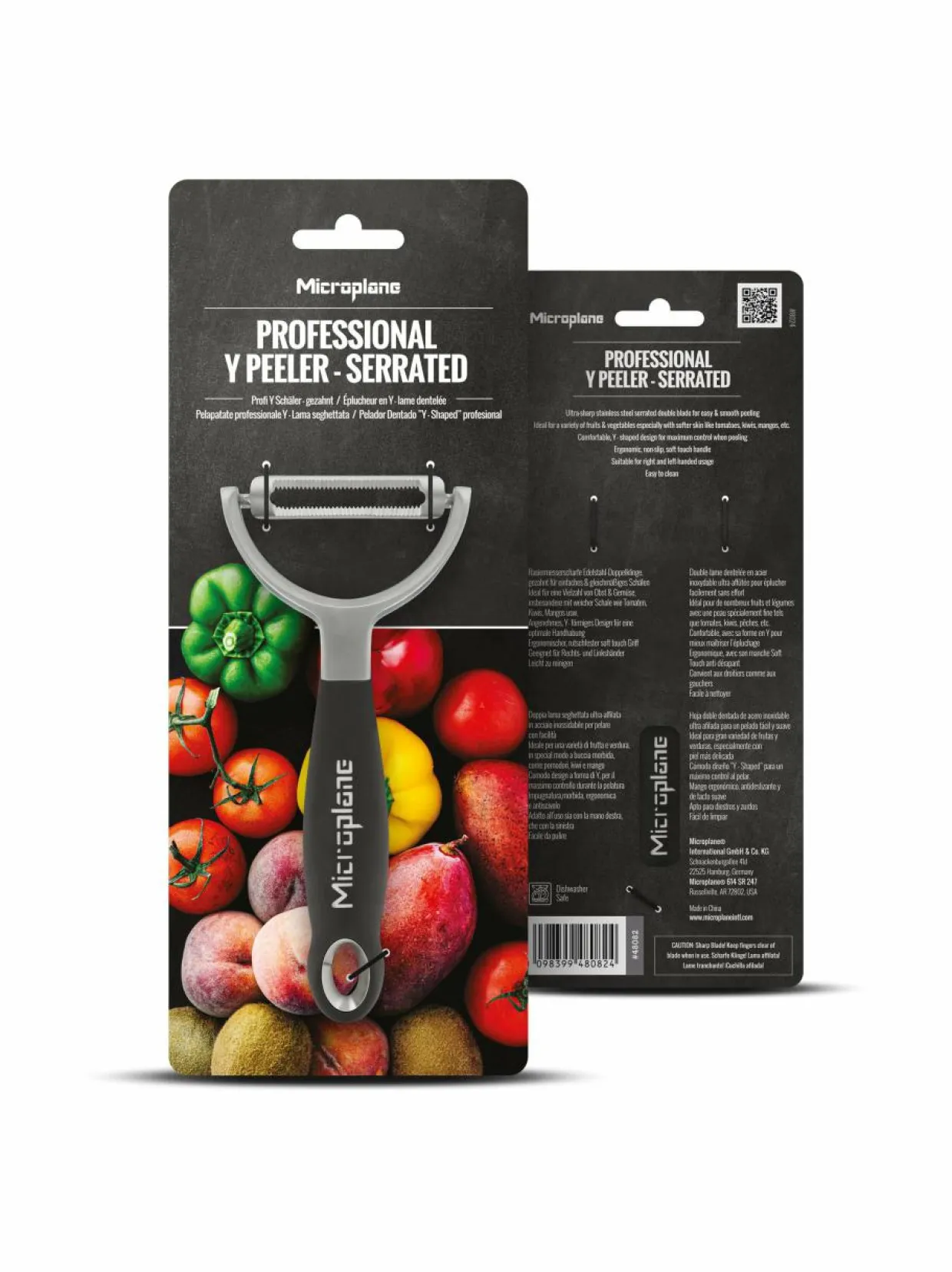 Professional Y -kuorijan sahalaitainen tuplaterä kuorii vaivatta pehmeäkuoriset hedelmät ja vihannekset. Se sopii mm. tomaateille, kiiveille, mangoille, paprikoille ja persikoille. Nokan avulla voit poistaa hedelmistä ja vihanneksista epätäydellisiä kohtia. Teräsosat ovat ruostumattomat. Mallissa on ergonominen kahva.