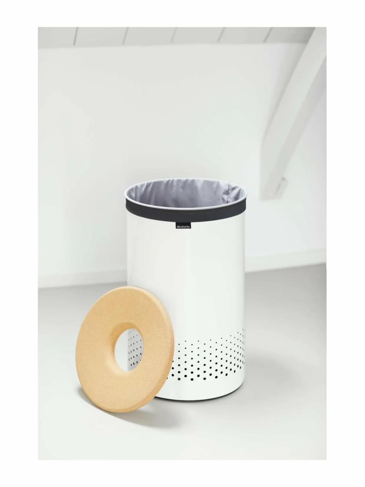 Tyylikäs pyykkikori on sekä käytännöllinen että kaunis. Tilavassa korissa on tukeva, teräksinen runko sekä irrotettava tekstiilisisusta. Pyöreässä, korkista valmistetussa kannessa on aukko pyykin pudottamista varten. Rungon alaosan tuuletusaukkojen ansiosta pyykki pääsee hengittämään. Pohjassa on muovisuojus, joka suojaa lattioita naarmuuntumiselta.