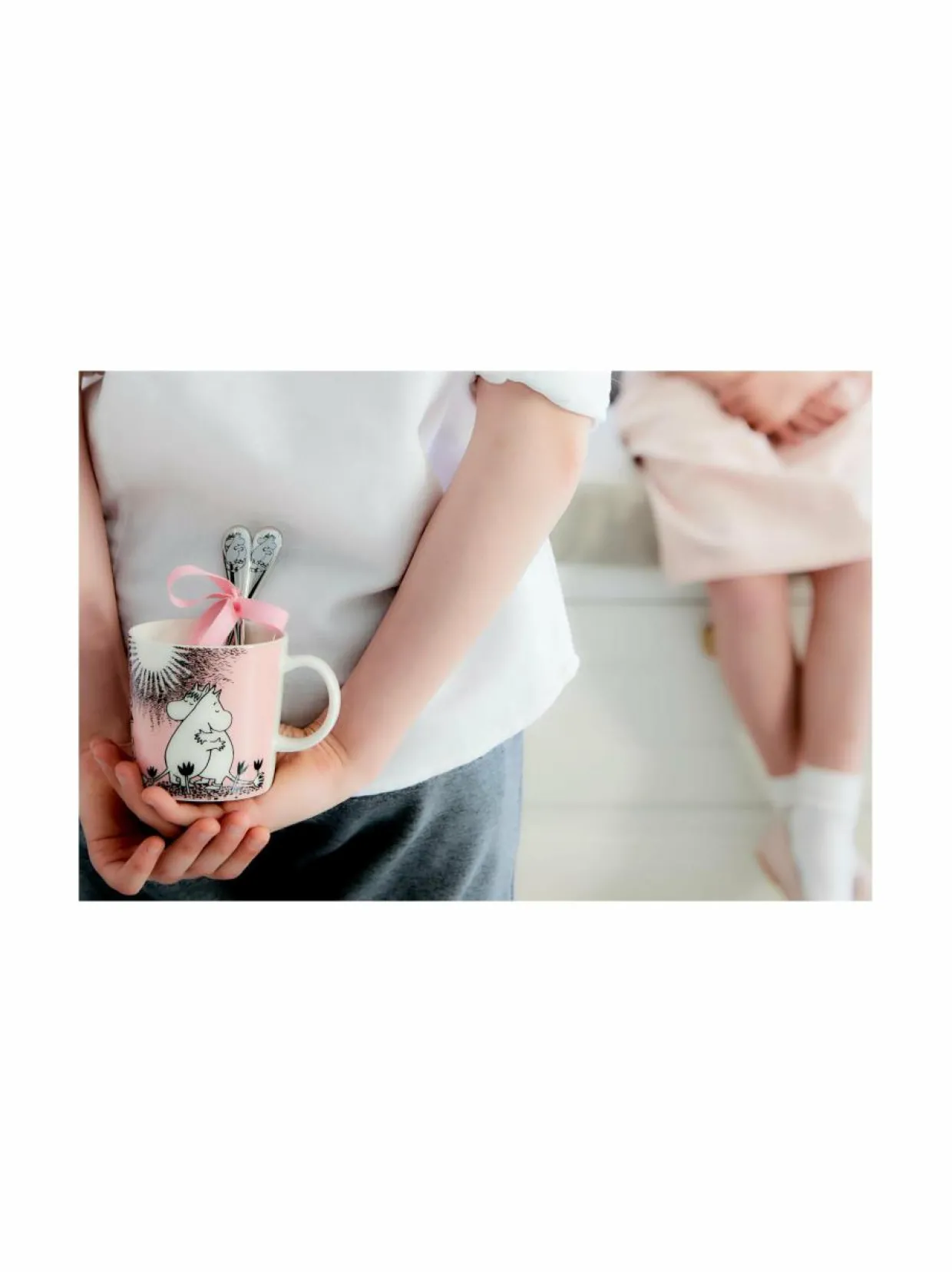 Halaus armaalle. Vaaleanpunaisen mukin kuvitus huokuu herkkää tunnelmaa. Arabian Muumi-astiat ovat uunin-, mikroaaltouunin- ja konepesunkestävää keramiikkaa. Ne kestävät myös ruoan pakastamisen.