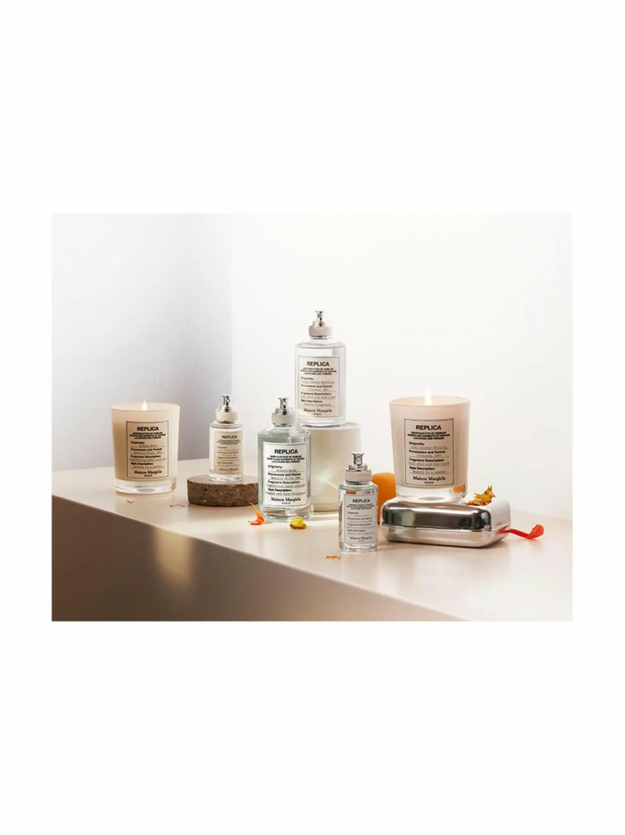 Vuonna 2012 Maison Margiela laajensi tätä ainutlaatuista konseptia tuoksukokoelmalla, joka tuo mieleen muistosi. Seuraavaksi vuorossa on kokoelma tuoksukynttilöitä.REPLICA-kokoelma sisältää ikonisia tuoksuja ja tuoksukynttilöitä, joiden yleismaailmallinen voima voi herättää henkilökohtaiset hetket ja tunteet.MUISTOISTA TUOKSUKSI:REPLICA-kokoelma sisältää ikonisia tuoksuja ja tuoksukynttilöitä, joiden yleismaailmallinen voima herättää henkilökohtaiset muistot ja tunteet. Maison Margiela tekee yhteistyötä parhaiden parfymöörien kanssa, jotka ovat valinneet aidon yhteyden muistoihin. Maison Margielaa stimuloi taiteellinen kyky luoda tuoksu, joka kutsuu herättämään, juhlimaan ja jakamaan unohtumattomia tunteita. Replica-kokoelman puuvillaetiketit muistuttavat vaatteiden etikettejä kertoen kustakin tuoksusta.