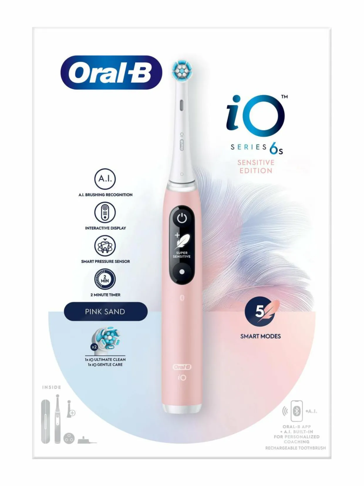 Oral-B sähköhammasharja iO 6S, jonka ainutlaatuisen pyöreän harjaspään hellävarainen mikrovärähtely antaa ammattimaisen puhtaan tunteen joka päivä.
