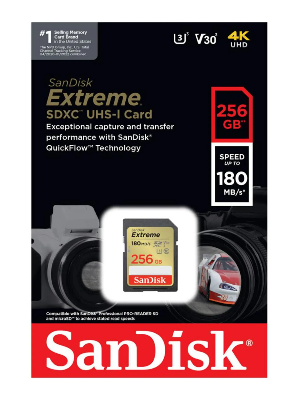 SanDisk Extreme 256GB SDXC (180MB/s) UHS-I (U3 / V30) muistikortti