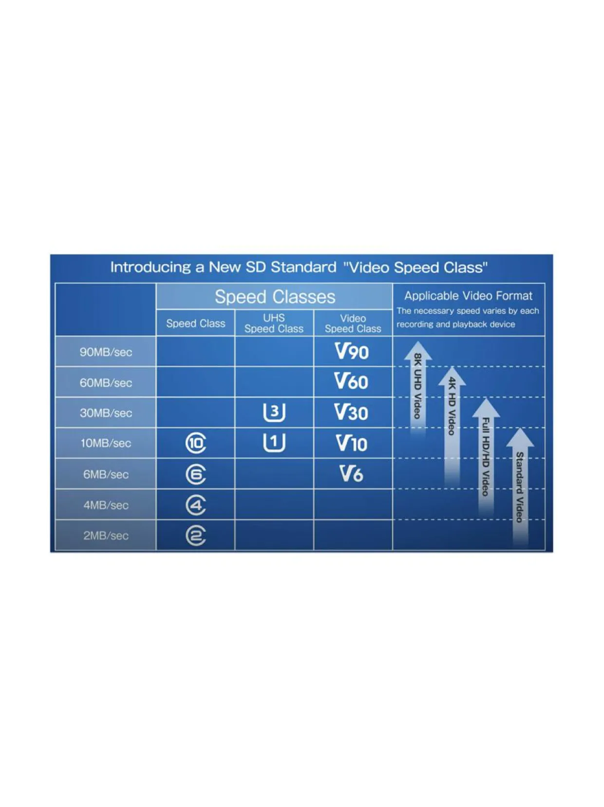 Nopea UHS-I muistikortti, riittää 4k videoon ja RAW-sarjakuvaukseen jos kamera ei tue UHS-II korttityyppiä