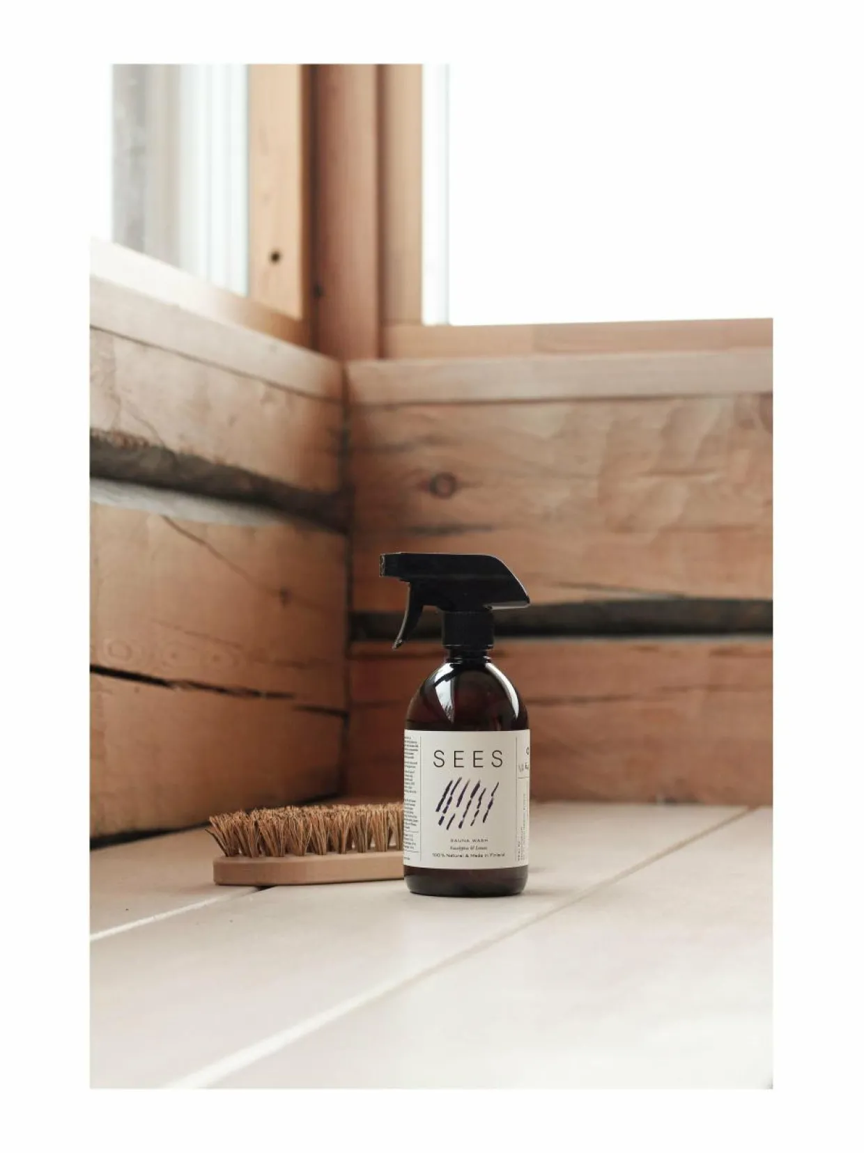 Biohajoava Sees Saunapesu on helppo tapa pestä koti- tai mökkisauna – ja samalla suihkuhuoneen kaakelit ja lasiovet. Spray-pullo tekee pesemisestä nopeampaa ja vaivatonta, eikä voimakasta jynssäämistä tarvita. Suomalaisena saunominen on lähellä sydäntä ja viihtyisän saunanillan saa aikaan puhdas ja raikkaan tuoksuinen sauna.Sooda-pohjainen saunapesu on tehokas pinttyneen lian ja hajujen poistaja. Eucalyptuksen ja sitruunan eteerisillä öljyillä tuoksutettu saunapesu on valmistettu korkealaatuisista kasviperäisistä raaka-aineista. Tuoksussa yhdistyy raikkaan sitruunan ja virkistävän eucalyptuksen eteeriset öljyt, jotka yhdessä piristävät ja raikastavat tehokkaasti koko saunan sekä tunkkaisen huoneilman. Pesun yhteydessä eteeristen öljyjen arvokkaat tuoksut vaeltavat ympäriinsä ja voit nauttia niiden aikaansaamasta aromaterapiasta.Saunapesu ei ainoastaan piristä pelkkää saunaa, vaan myös pesijän mielen. Suomessa valmistettu saunanpesuaine kuormittaa vähemmän luontoa ja on 100 % luontoon biohajoava. Pesuaineessa ei ole käytetty keinotekoisia ainesosia tai tuoksuaineita.Saunapesuaineella peset kätevästi lauteet, penkit, seinät, lattiat, suihkutilat ja jopa saunan vadit — erinomainen valinta suomalaiseen saunaan.