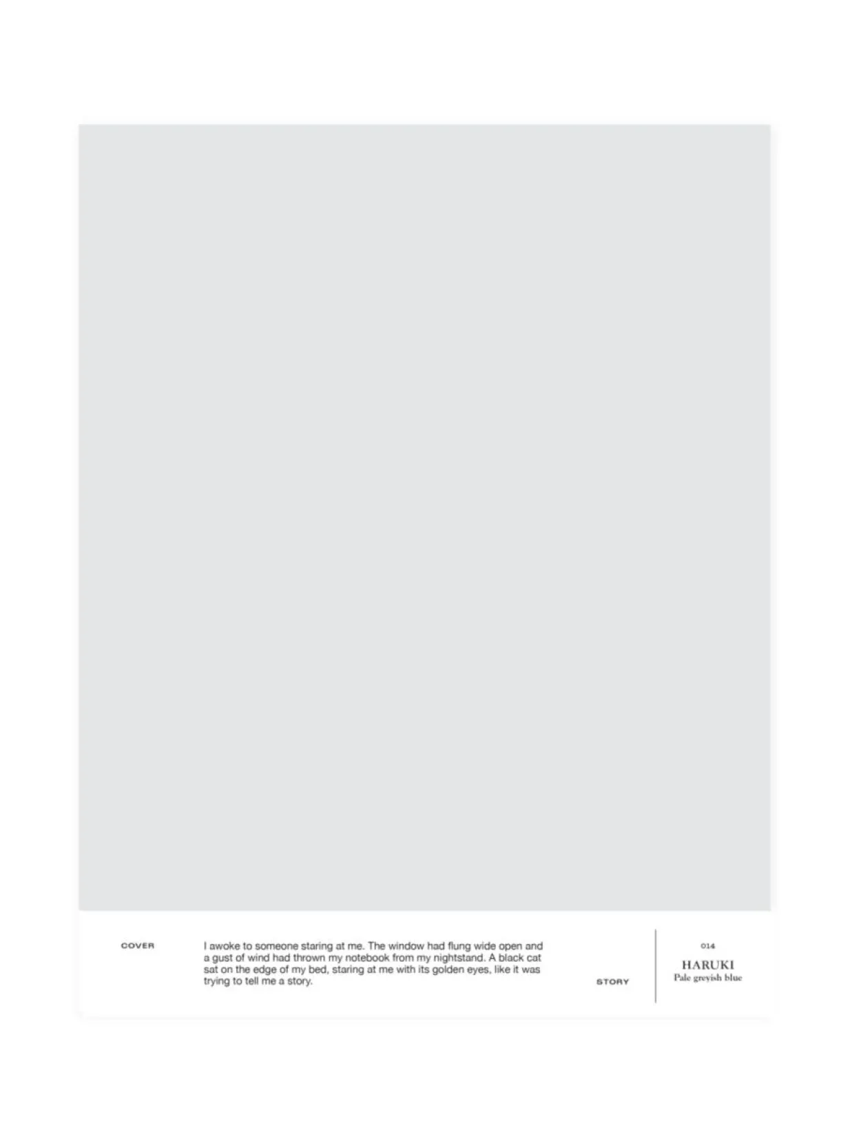 014 HARUKI on lämpimän levollinen siniharmaa sävy, joka sopii pastelliseen palettiin tai osaksi valkoista kokonaisuutta. A4-kokoinen ja tarrataustainen värimalli on maalattu aidolla täyshimmeällä Cover Story -maalilla, joten voit olla varma, että sävy on sama kuin varsinaisessa maalissa. Mallitarran voi liimata helposti suoraan maalattavalle pinnalle ja katsoa, miltä sävy näyttää erilaisissa valaistuksissa, sillä valon laatu ja määrä vaikuttavat merkittävästi siihen, miten havaitsemme värin.