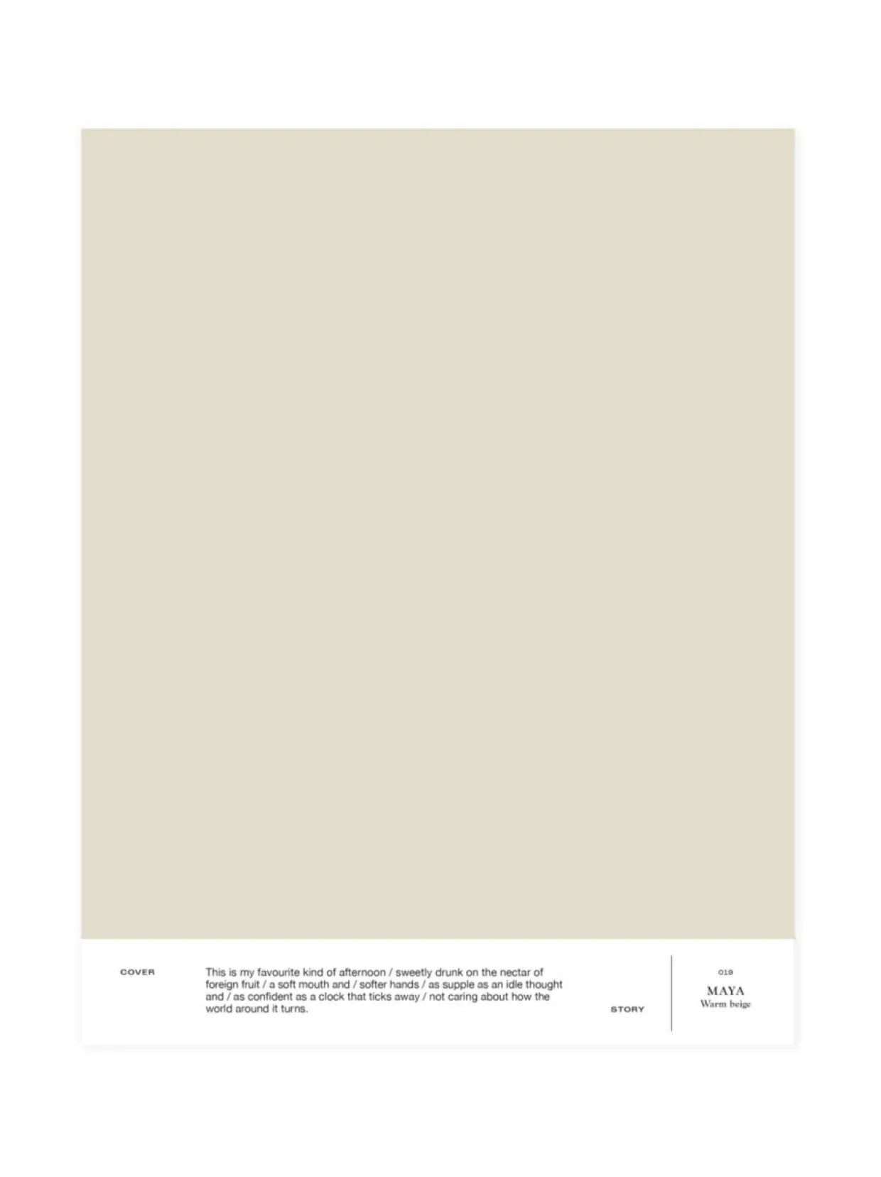 019 MAYA on hillitty ja luonnollinen beige ripauksella lämpöä. A4-kokoinen ja tarrataustainen värimalli on maalattu aidolla täyshimmeällä Cover Story -maalilla, joten voit olla varma, että sävy on sama kuin varsinaisessa maalissa. Mallitarran voi liimata helposti suoraan maalattavalle pinnalle ja katsoa, miltä sävy näyttää erilaisissa valaistuksissa, sillä valon laatu ja määrä vaikuttavat merkittävästi siihen, miten havaitsemme värin.