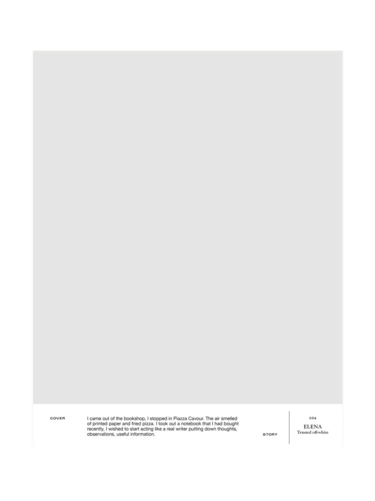 034 ELENA on pehmeä, aavistuksen vaaleanharmaa maalisävy. Murrettu valkoinen tuo lämpöä ja pehmentää tilan tunnelmaa taittamatta keltaiseen. Luottovaalea 034 ELENA on suunnittelija Ulla Koskisen suunnittelema. A4-kokoinen ja tarrataustainen värimalli on maalattu aidolla täyshimmeällä Cover Story -maalilla, joten voit olla varma, että sävy on sama kuin varsinaisessa maalissa. Mallitarran voi liimata helposti suoraan maalattavalle pinnalle ja katsoa, miltä sävy näyttää erilaisissa valaistuksissa, sillä valon laatu ja määrä vaikuttavat merkittävästi siihen, miten havaitsemme värin.