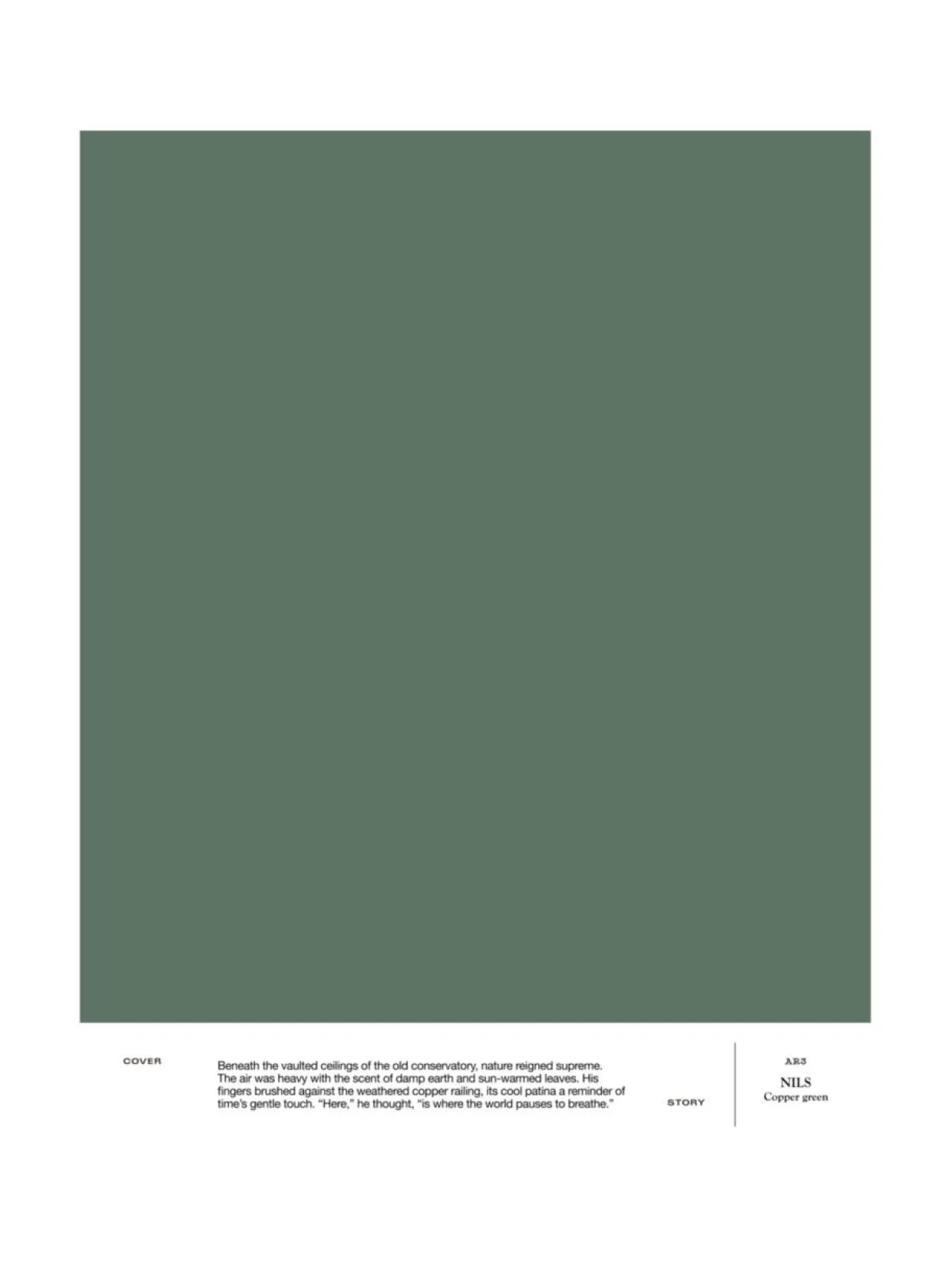AR3 NILS – Copper green on hienostunut vihreä, joka ammentaa sävynsä patinoituneesta kuparista. Tämä syvä, maanläheinen sävy tuo tilaan arvokkuutta ja eleganssia, samalla kun se luo rauhallisen ja tasapainoisen tunnelman. Sävy on osa Cover Story x Artek Helsinki -sisämaalikokoelmaa. A4-kokoinen tarrataustainen värimalli on maalattu aidolla täyshimmeällä Cover Story -maalilla, joten voit olla varma, että sävy on sama kuin varsinaisessa maalissa. Mallitarran voi liimata helposti suoraan maalattavalle pinnalle ja katsoa, miltä sävy näyttää erilaisissa valaistuksissa – valon laatu ja määrä vaikuttavat merkittävästi siihen, miten havaitsemme värin.
