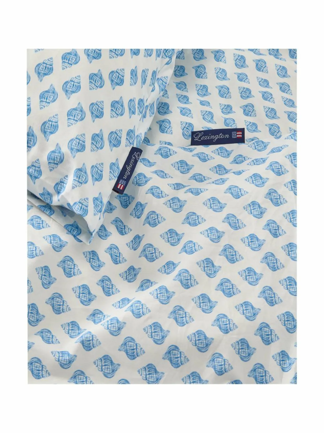 Lexingtonin kesämallistoon kuuluva pussilakanasetti käsinmaalatulla simpukkakuosilla. Vilpoisasta ja raikkaasta puuvillapopliinista valmistettu vuodevaatesetti sisältää pussilakanan, jossa on Lexingtonin logonapit, ja kirjekuorimallisen tyynyliinan.