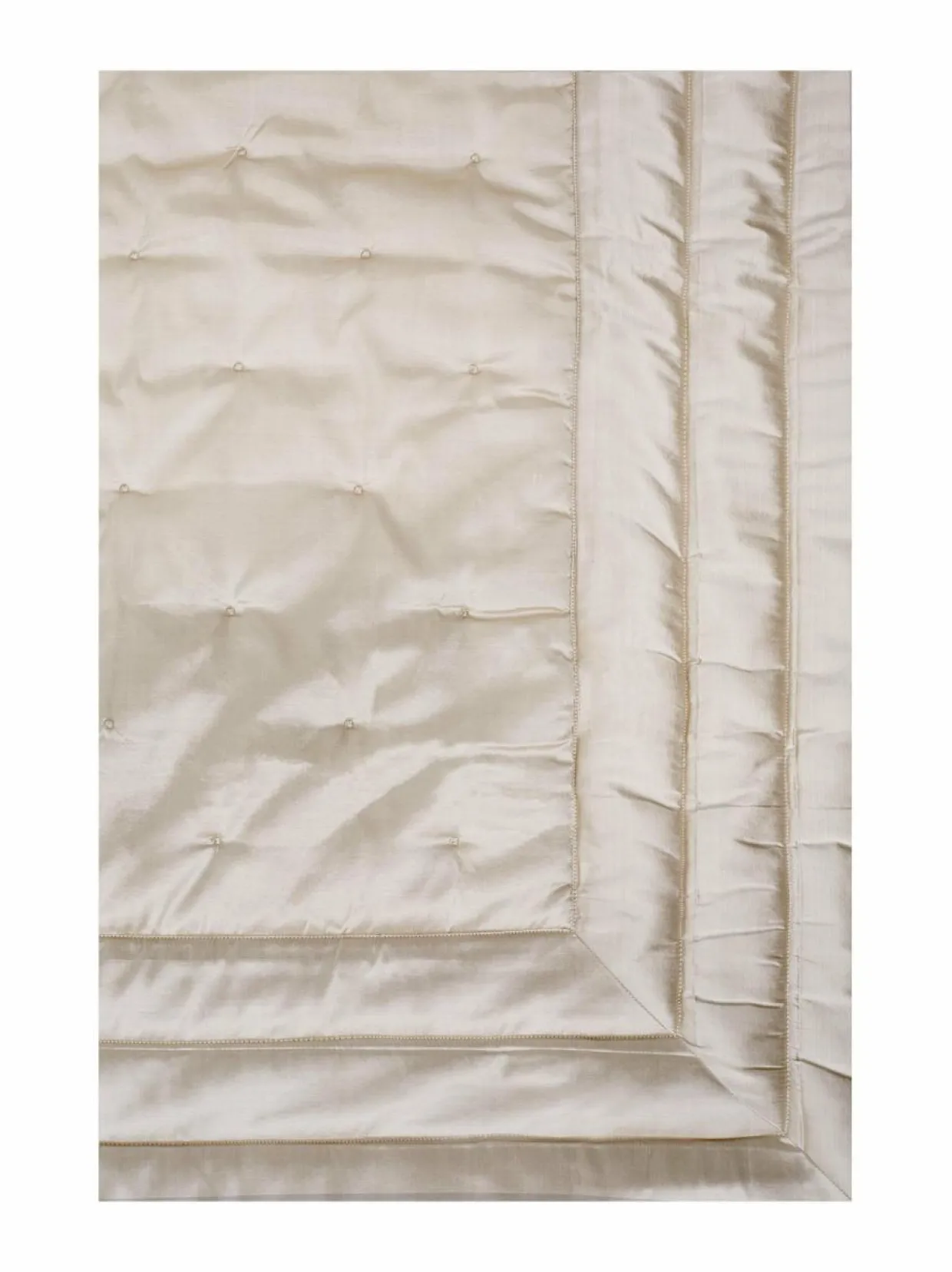 Silky-päiväpeite on valmistettu dupionsilkistä, joka on kudottu, kauniisti hohtava 100 % silkkikangas. Kankaalle tunnusomaista ovat kudelangan vahvuuden pieni vaihtelu, joka tekee kankaasta eläväpintaisen. Peitteessä on tikattu pinta.
