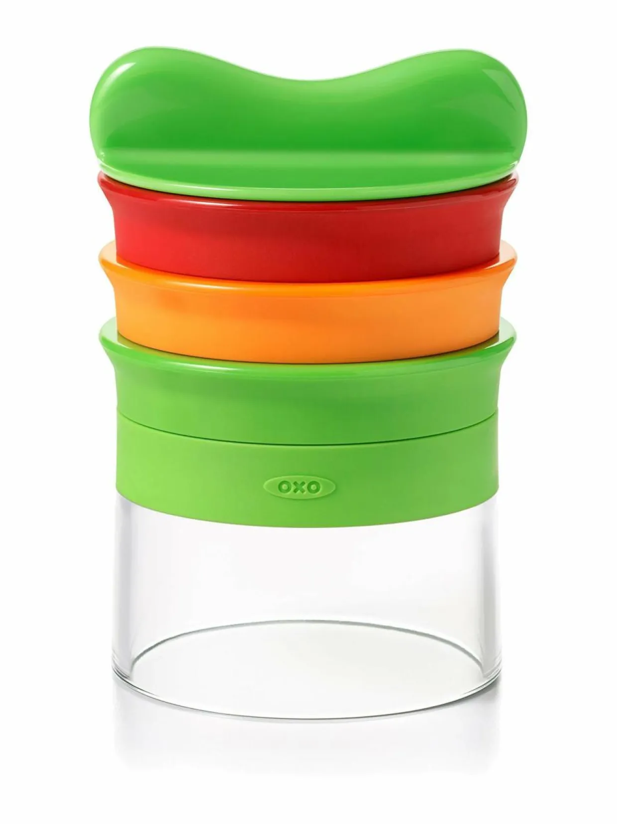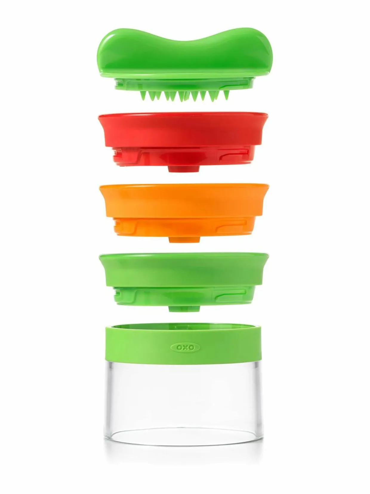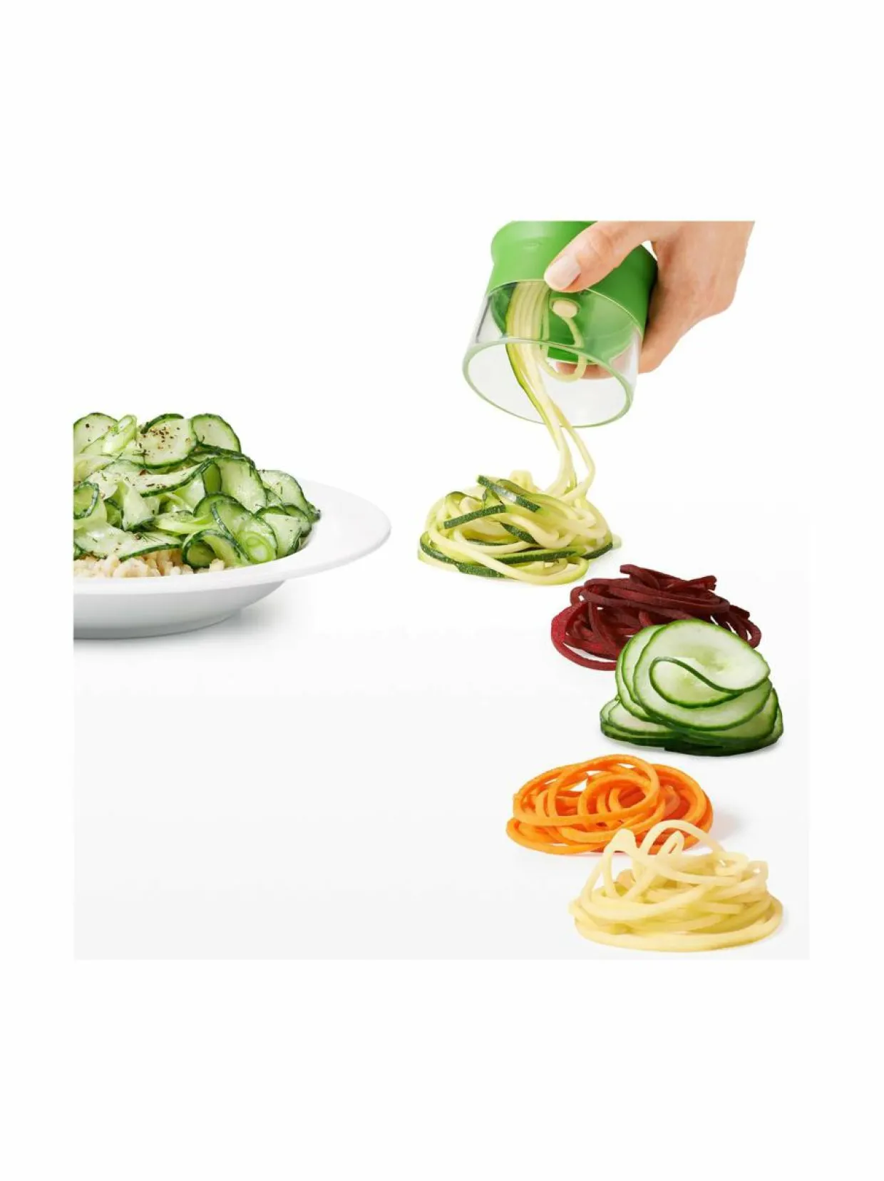 Käsikäyttöisessä Oxo-spiraalileikkurissa on kolme vaihdettavaa terää, joilla luot täydelliset spiraalinauhat niin pitkistä vihanneksista kuin pyöreistä hedelmistä hetkessä. 3,2 mm Spaghetti cut -terä leikkaa erilaisista vihanneksista spagettimaisen kapeaa nauhaa; 6,4 mm Fettuccine Cut -terä luo nauhapastamaista spiraalia. Ribbon Cut -terällä spiraloit leveämpää vihannesnauhaa mehevämmäksi lisukkeeksi tai koristeeksi salaatteihin. Kokeile leikata kesäkurpitsaa, porkkanaa, punajuurta, kurkkua tai omenaa!