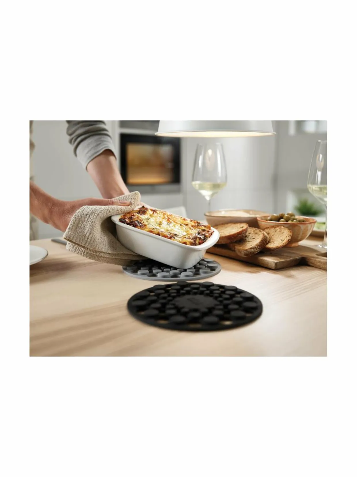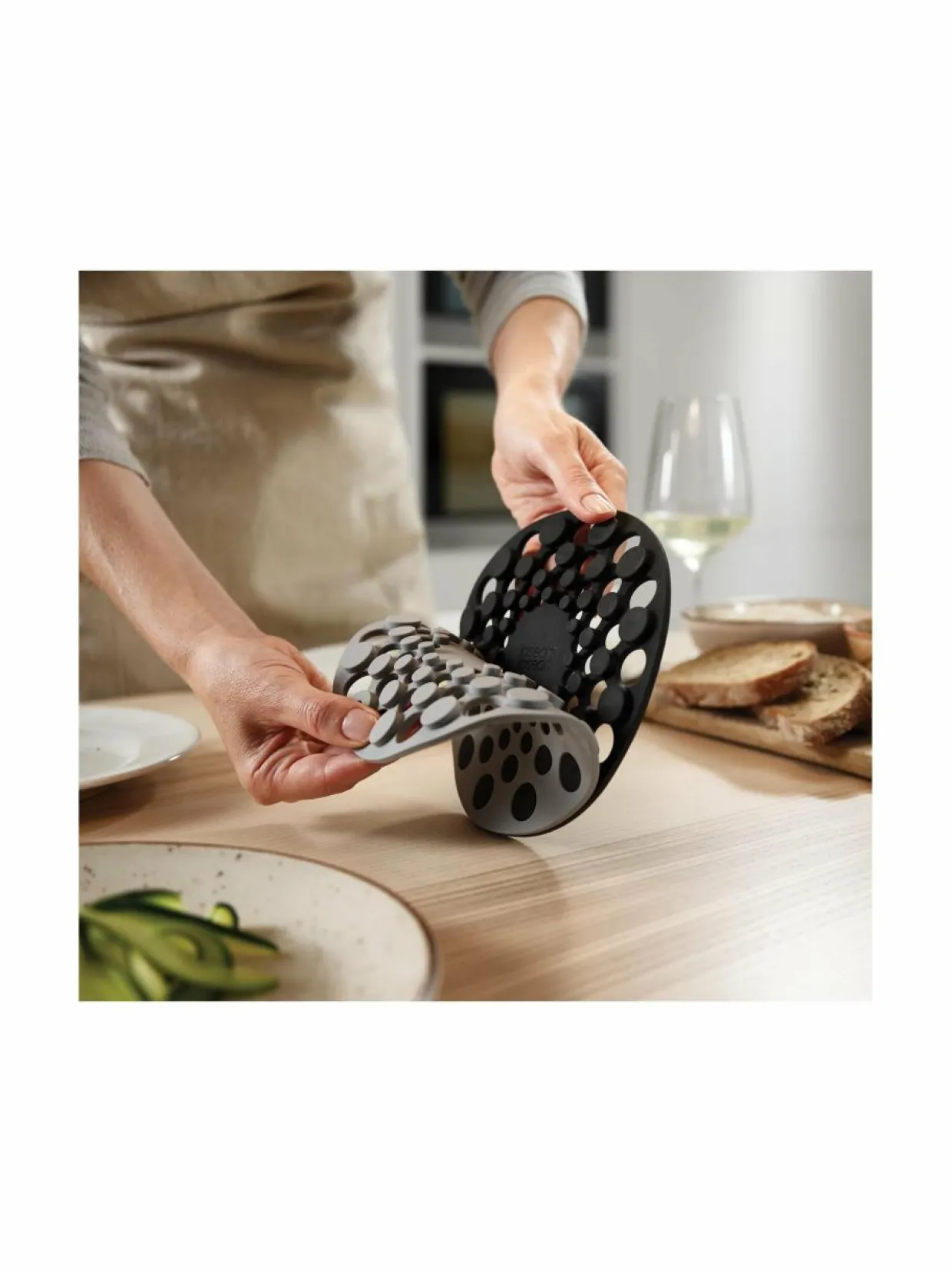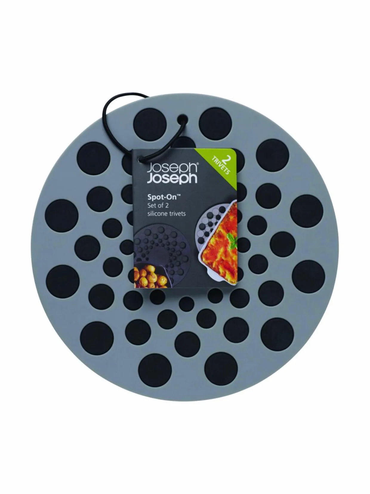 Joseph Joseph Spot-On -settiin sisältyy kaksi pyöreää pannunalusta. Irrota ne toisistaan ja aseta pisteet ylöspäin. Materiaali on kuumankestävää silikoniseosta. Astianpesukoneen kestävä.