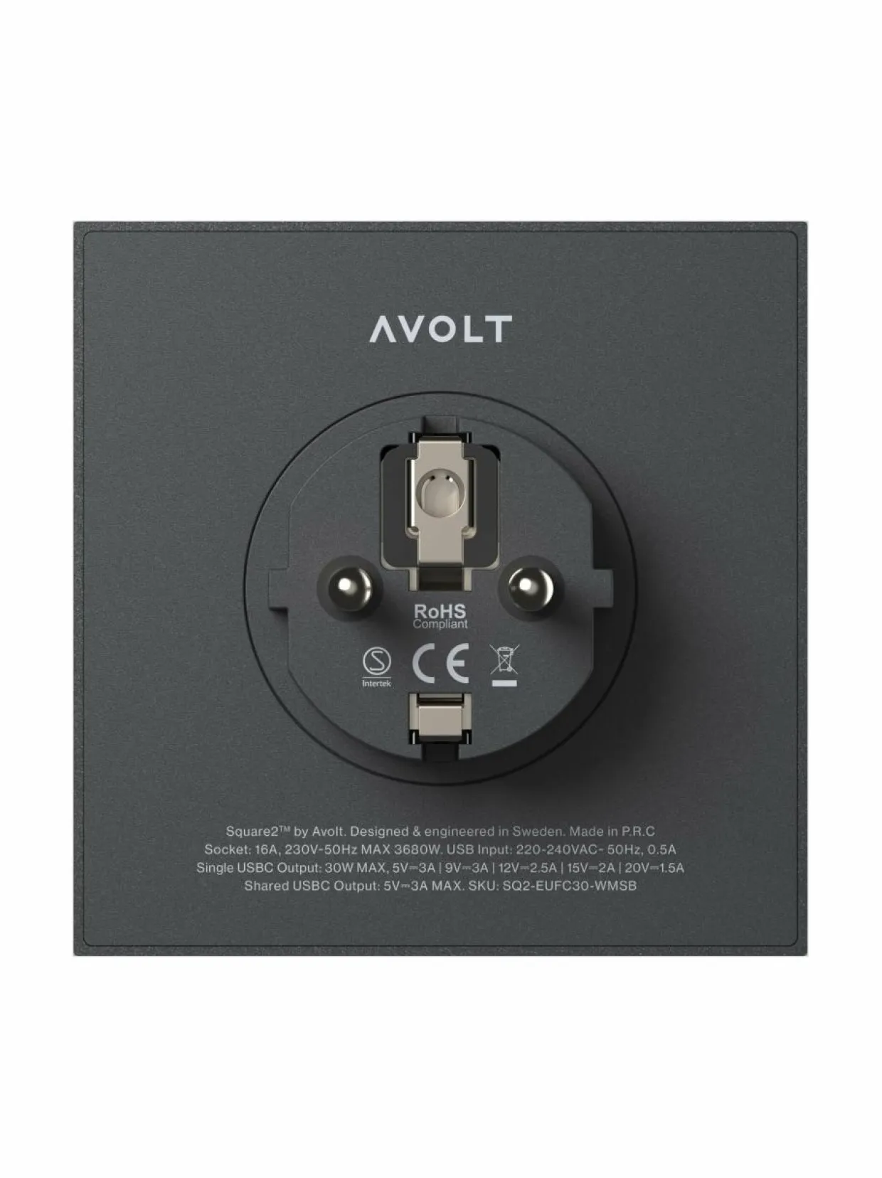 Avoltin valmistama ja J.Runströmer ja v. Lundbergin suunnittelema Square 2 USB-C. Square 2 sisältää kolme pistorasiaa ja kaksi USB C porttia. USB C-portit voivat tuottaa yhteensä 30 wattia, joten laite sopii mainiosti mobiililaitteiden kuten iPhonen, iPadin, MacBook Airin ja AirPodin pikalataukseen. Square 2 on valmistettu 20 % kierrätetystä materiaalista ja sen mattapintainen spray viimeistely on patentoitu valmistajan toimesta. Jatkojohdon pystyy kiinnittämään suoraan pistorasiaan ja se jää siihen paikoilleen. Square 2 on saatavilla useilla eri väreillä.