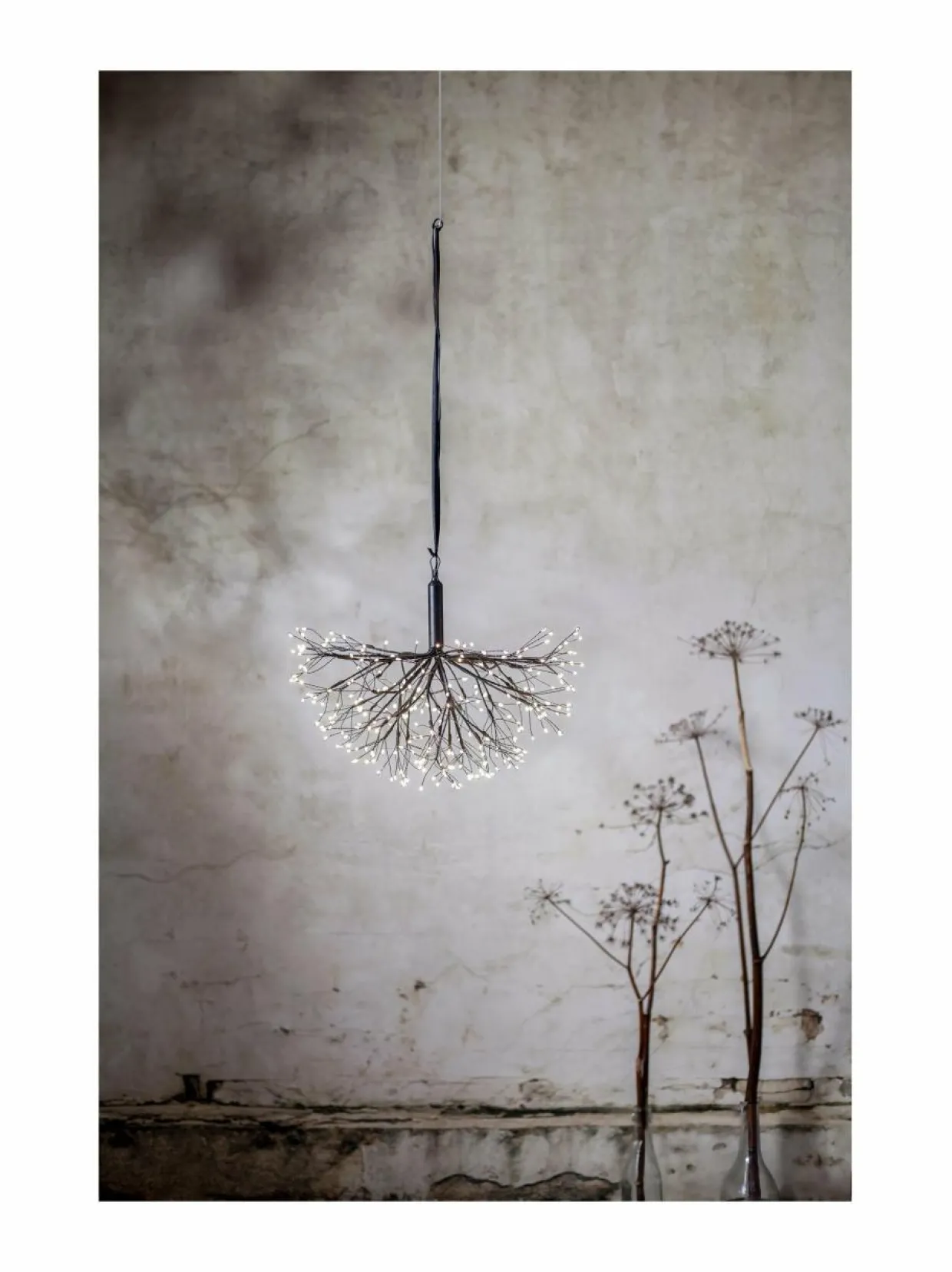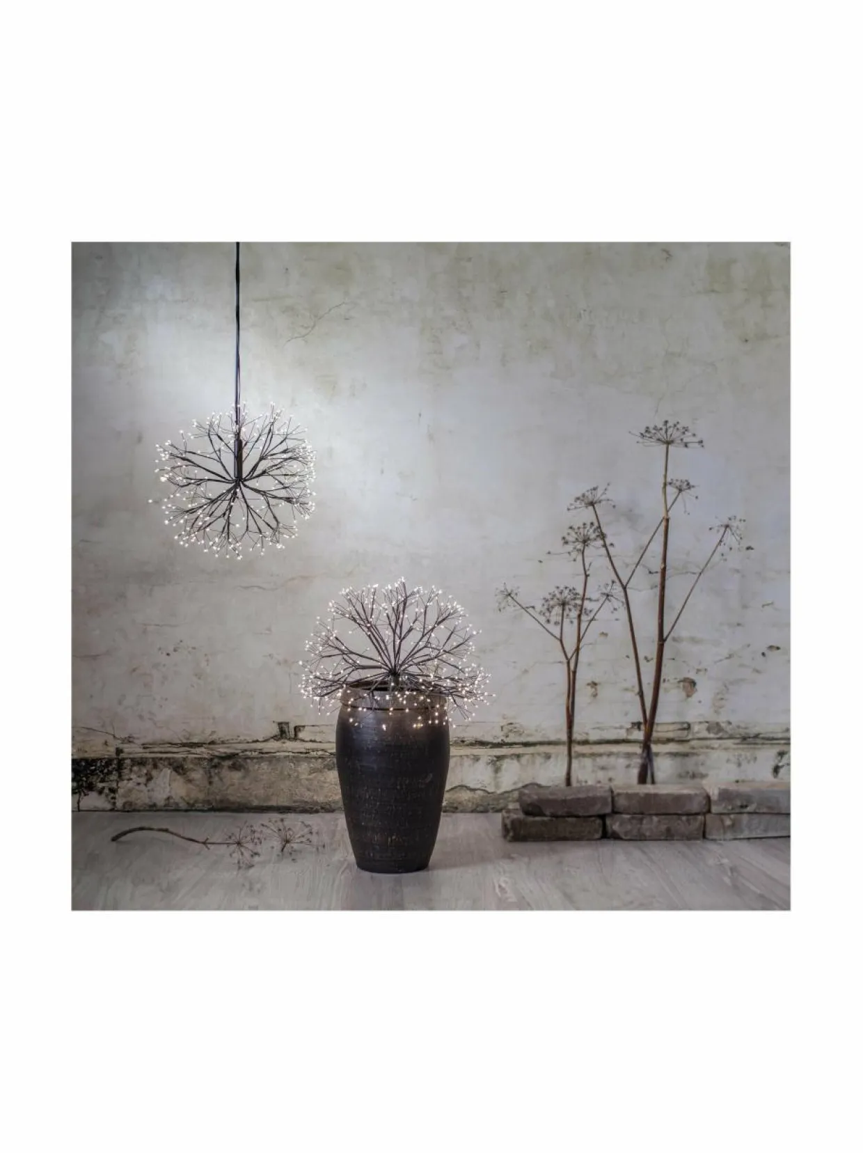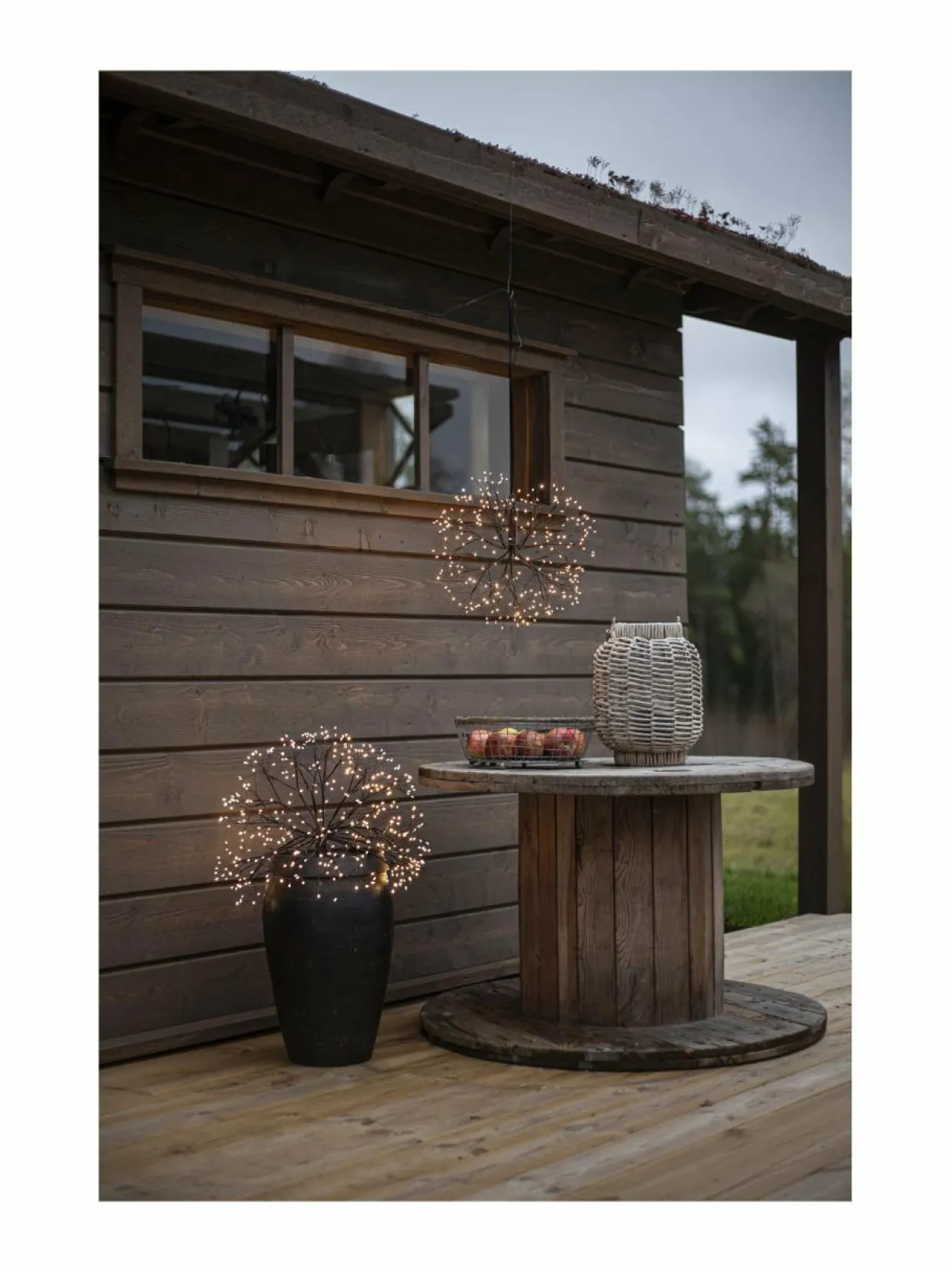 Ulko- ja sisäkäyttöön sopiva koriste, jonka voi joko ripustaa roikkumaan tai asettaa esimerkiksi ruukkuun. Koristeessa on 16 muotoiltavaa oksaa, ja niissä 288 lämpimän valkoista LED-valopistettä. Koristeessa on myös ajastintoiminto, jonka avulla valot palavat 6 tunnin ajan kerrallaan ja syttyvät seuraavana päivänä samaan aikaan uudelleen. Johdon pituus 500 cm. Halkaisija 40 cm. Kiinteä LED, lamppuja ei voi vaihtaa. Lamppujen paloaika n. 7 000 tuntia. Energialuokka G.