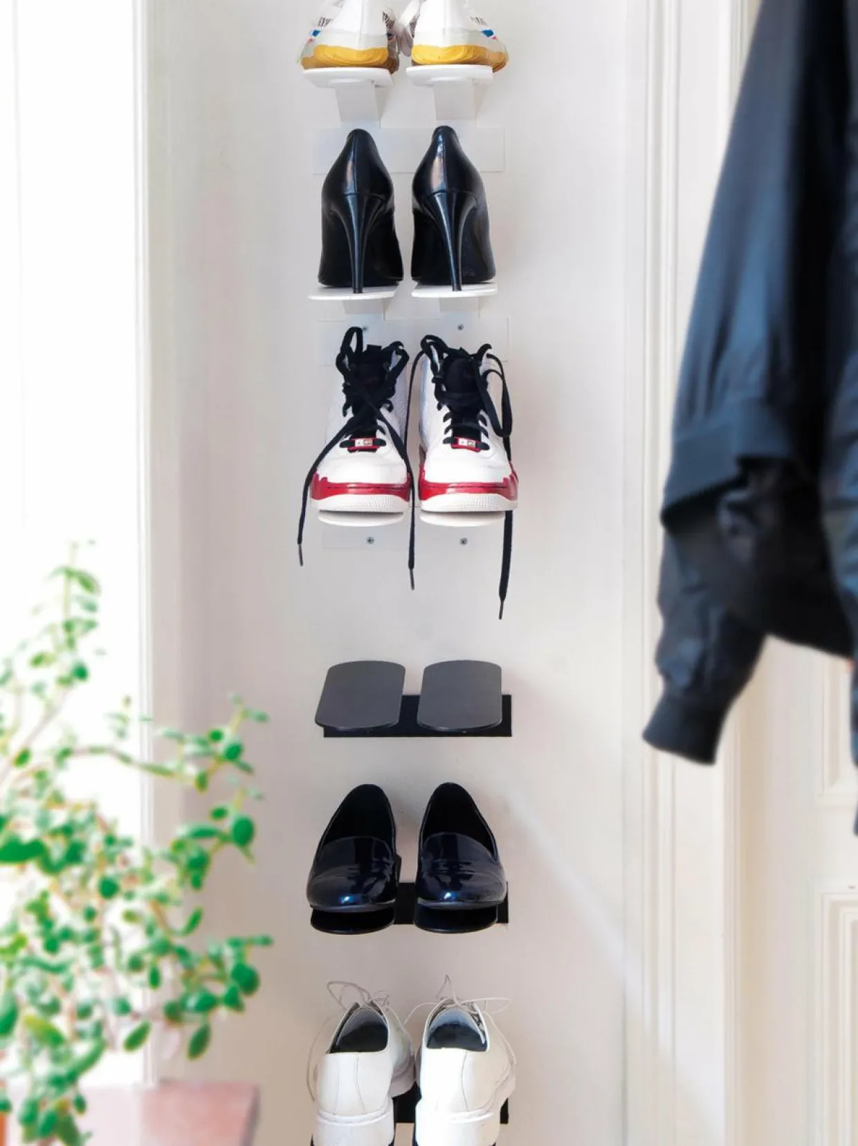 Step S -kenkätelineeseen saa tyylikkäästi esille kaikenlaiset kengät. Gustav Rosénin suunnittelemassa telineessä on kaksi soikeaa ja hieman viistoa metallilevyä, joiden päällä kengät ovat siististi ja näyttävästi esillä. Useammalla hyllyllä rakennat vaikuttavan kokonaisuuden. Mitat ovat 9 x 20 x 29 cm.