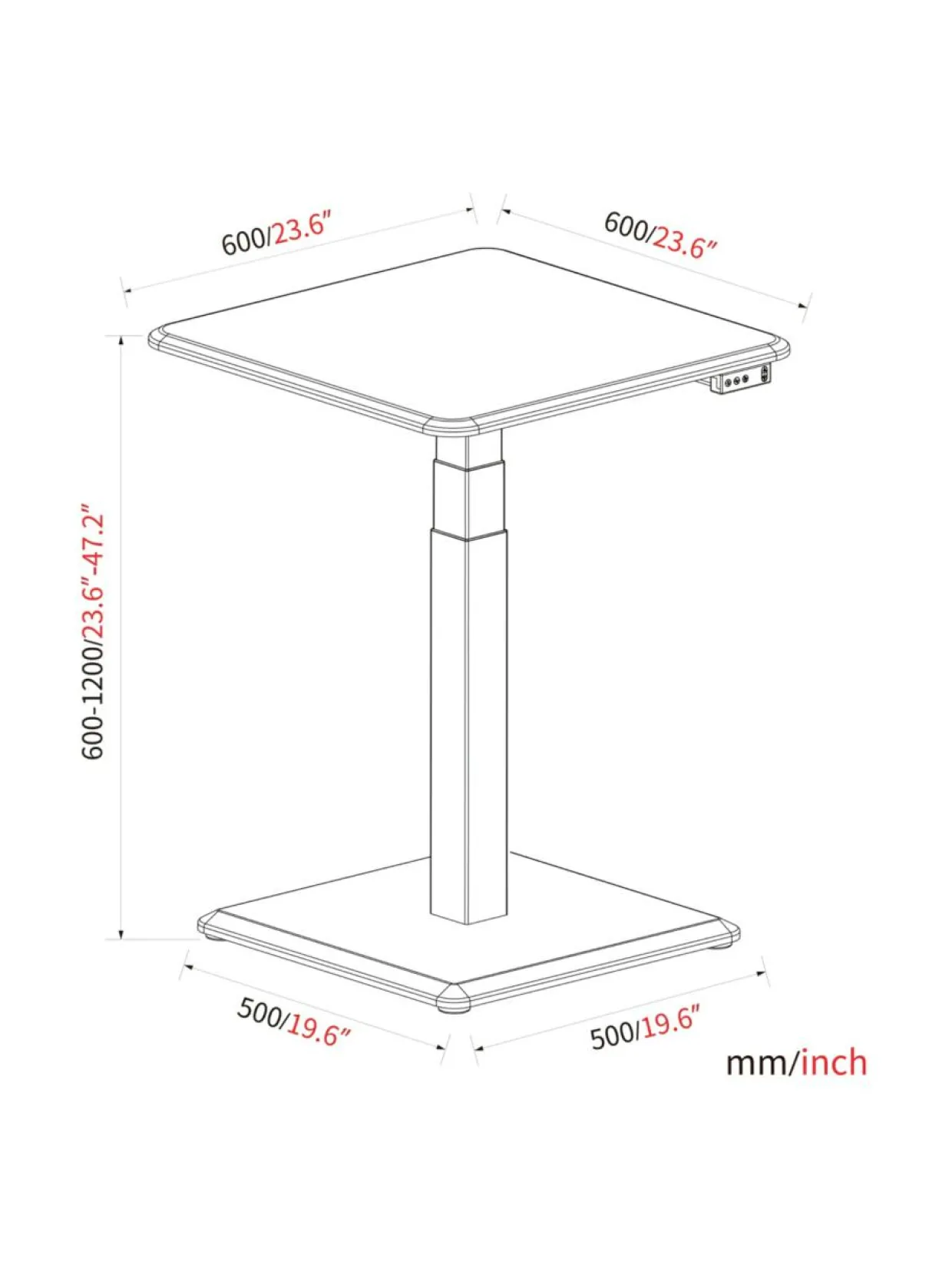 Pöytälevyn koko 600×600 mm.