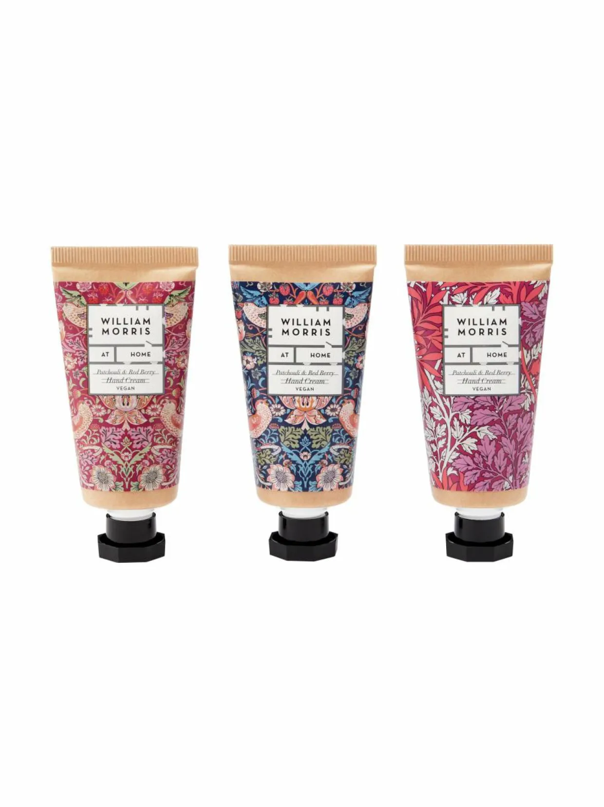 William Morriksen Strawberry Thief -käsivoiteet 3 x 30 ml on pakkaus, joka sisältää 3 käsivoidetta William Morriksen suunnittelemilla taideprinteillä. Ne ravitsevat ihoa kookos- ja sheavoilla sekä jojoba- ja makadamiaöljyillä. Lisäksi ne sisältävät antioksidanttien täyteistä appelsiiniuutetta ja E-vitamiinia, makeaa appelsiininkuoriöljyä ja suojaavaa mansikansiemenuutetta.