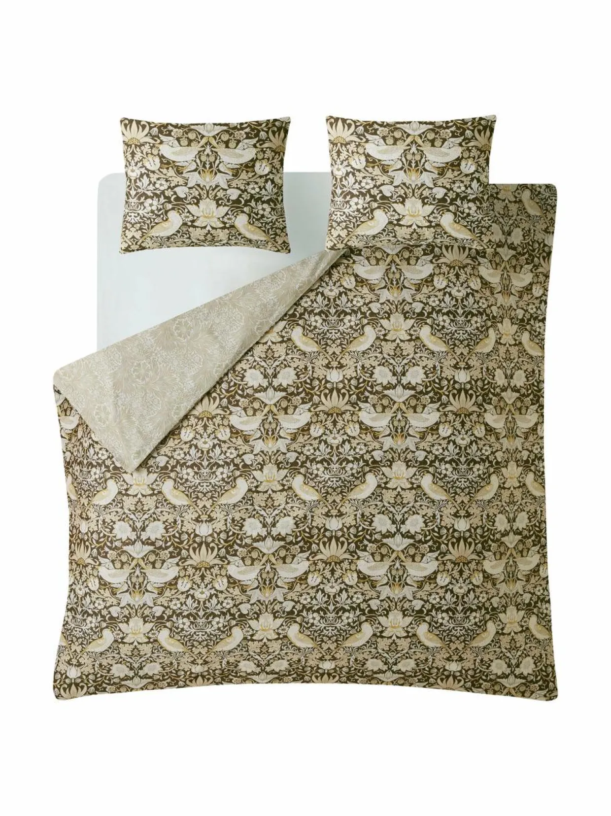 Vuonna 1883 suunniteltu William Morrisin Strawberry Thief -printti on saanut inspiraationsa rastaista, jotka olivat hiipineet hänen mansikkaverkkojensa alle hänen puutarhassaan Kelmscott Manorissa Oxfordshiressa. Digitaalisesti painettu pehmeälle puuvillasatiinipohjalle (lankaluku 220) ja väritetty ihastuttavaan väripalettiin. Tässä kauniissa pussilakanasetissä on herkkä Marigold-printti kääntöpuolella pehmeässä sävyssä.