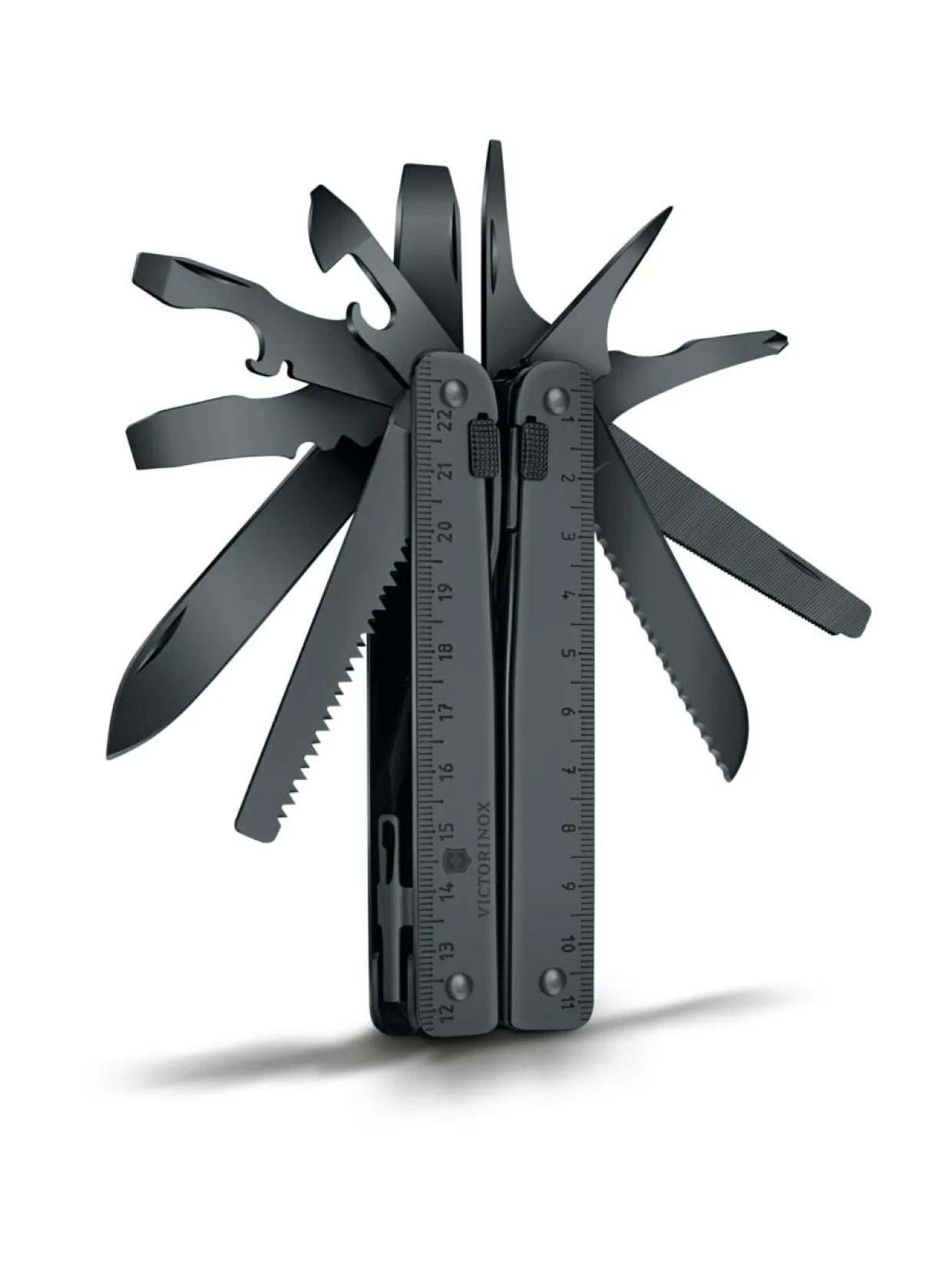 Järeä monitoimityökalu ammattimaiseen käyttöön. SwissToolin kaikki terät ovat lukittuvia ja siksi sen käyttö on turvallista. Kaikki terät aukeavat suoraan sivuilta ilman että pihtejä tarvitsee avata. Työkalun musta viimeistely suojaa korroosiolta. Musta suojakerros valmistetaan emäksisellä käsittelyllä, jota kutsutaan oksidoinniksi. Suojaava kerros on vaaraton ihmisille ja eläimille (EC 1935/20049) ja se voidaan puhdistaa käyttöoppaassa olevien ohjeiden mukaisesti.