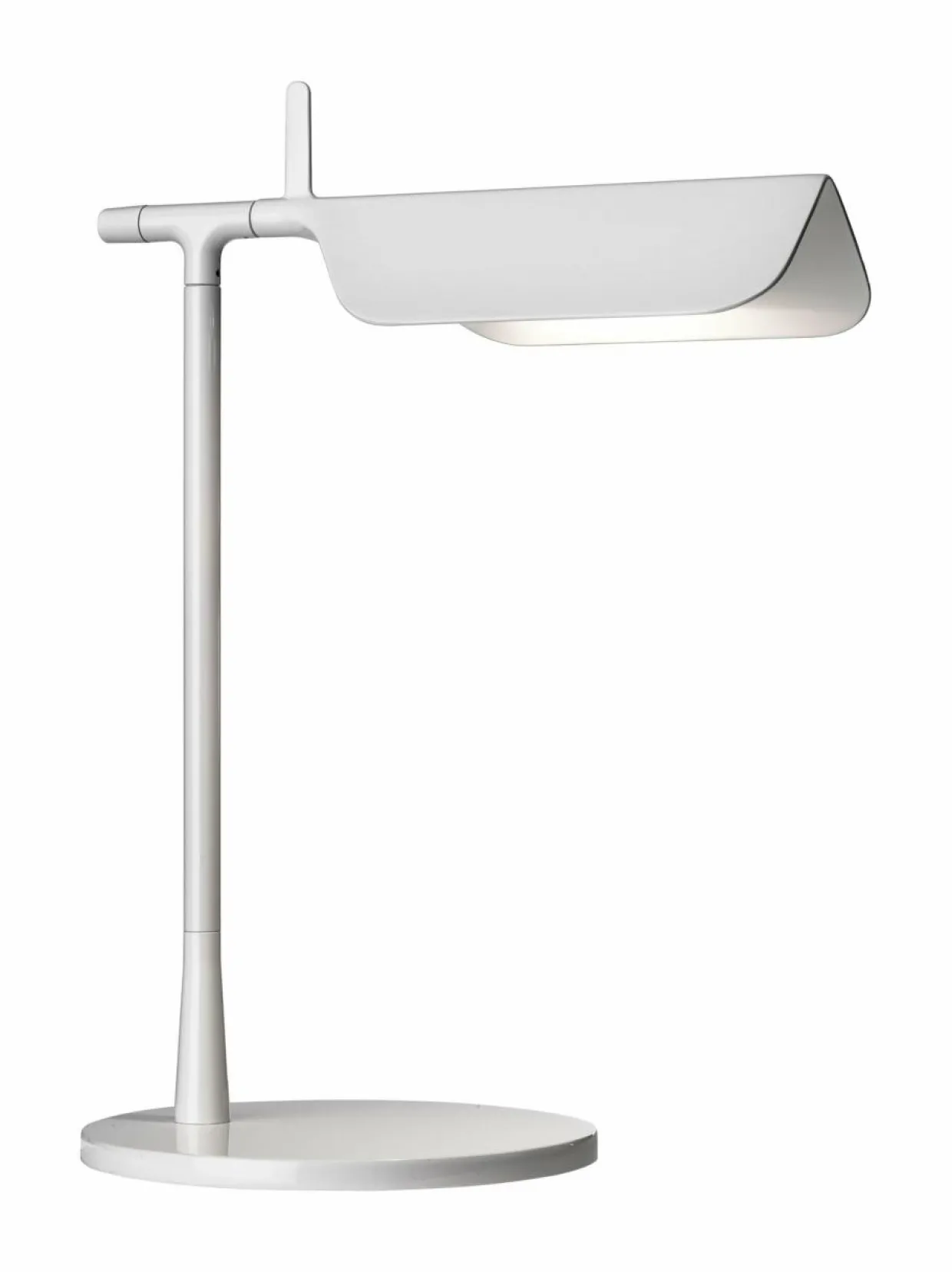Näyttävä ulkomuoto ja käytännöllisyys yhdistyvät Flosin Tab Table -pöytävalaisimessa. Varjostin kääntyy 45 astetta, joten valon saa aina kohdistettua oikeaan kohtaan. Suunnittelu Edward Barber & Jay Osgerby, 2011.