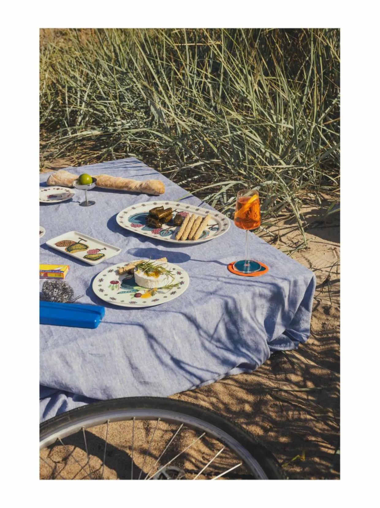 Asetelmataiteen innoittama kuvio luo pysähtyneen tunnelman taianomaisine hedelmineen ja vihanneksineen. Klaus Haapaniemen kiehtovat kuvitukset yhdistyvät Heikki Orvolan pelkistettyihin muotoihin, luoden oman universuminsa. Taika Sato suorakaiteen muotoinen lautanen sopii tarjoiluun ja on kaunis sisustusesine sellaisenaan.