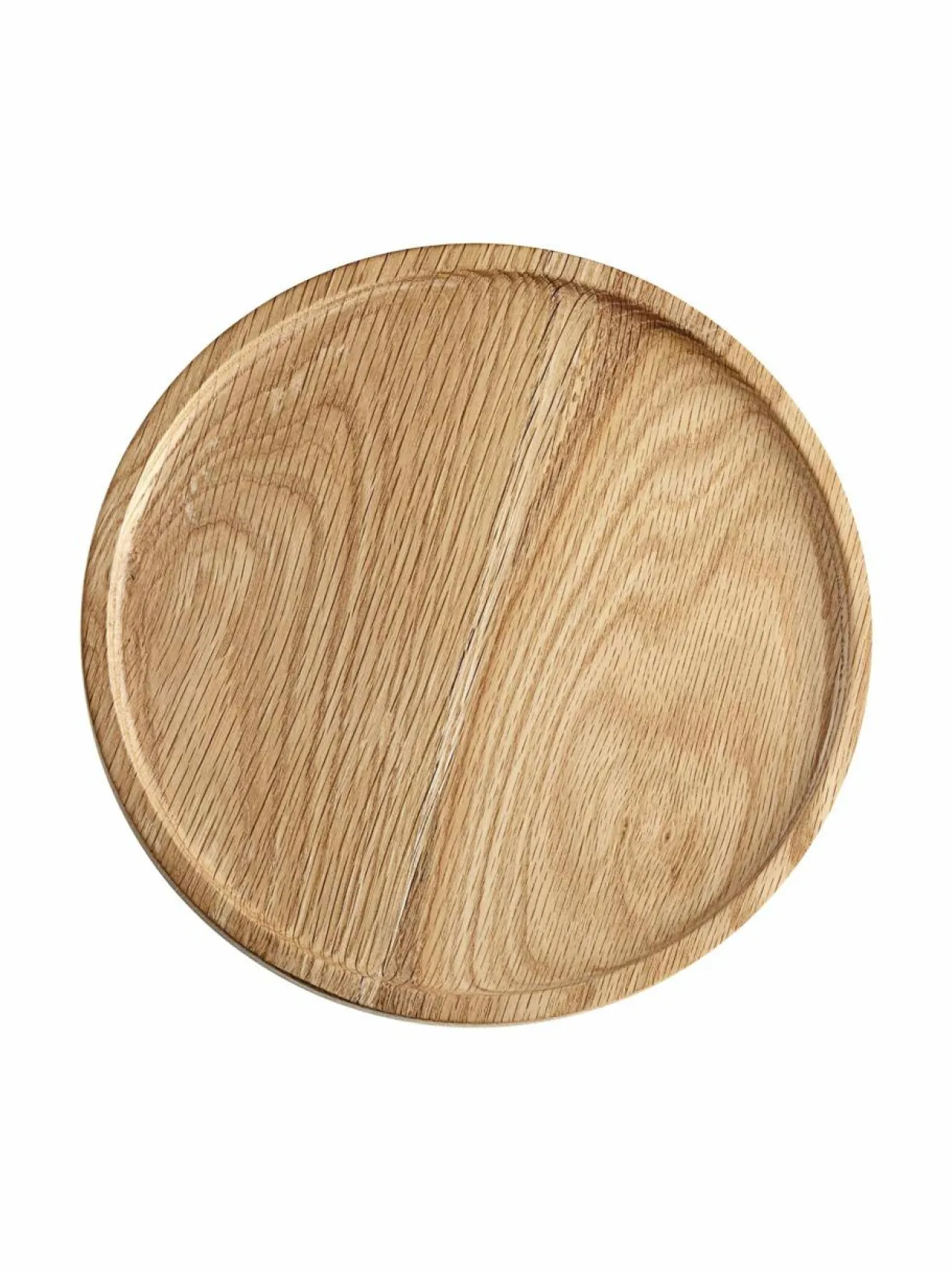 Ajattoman tyylikkäästi muotoiltu tarjotin on tammea. Halkaisija on 28 cm.