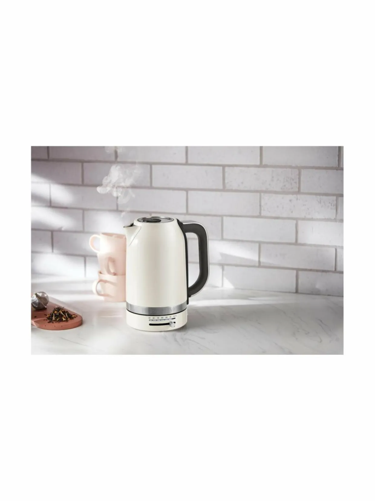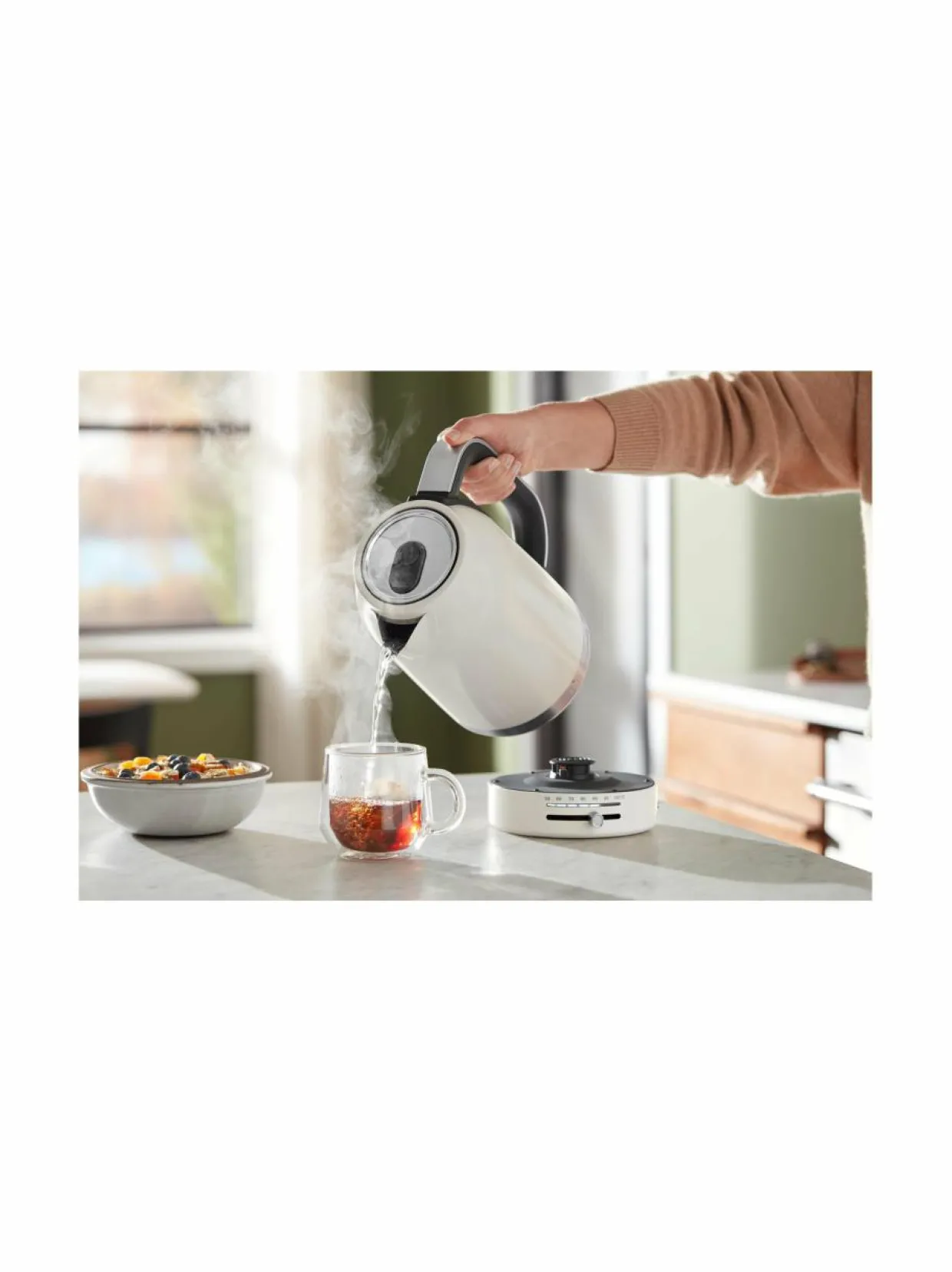 KitchenAidin vedenkeitin, jonka lämpötilaa voi säätää 50–100 °C:n välillä. Runko on ruostumatonta terästä. Se kuumentaa veden nopeasti haluamaasi lämpötilaan. Johto piiloutuu huomaamattomasti 360° alustan alle, jotta se ei vie tilaa työtasolla. Pakkauksen sisältö ja lisätiedot: