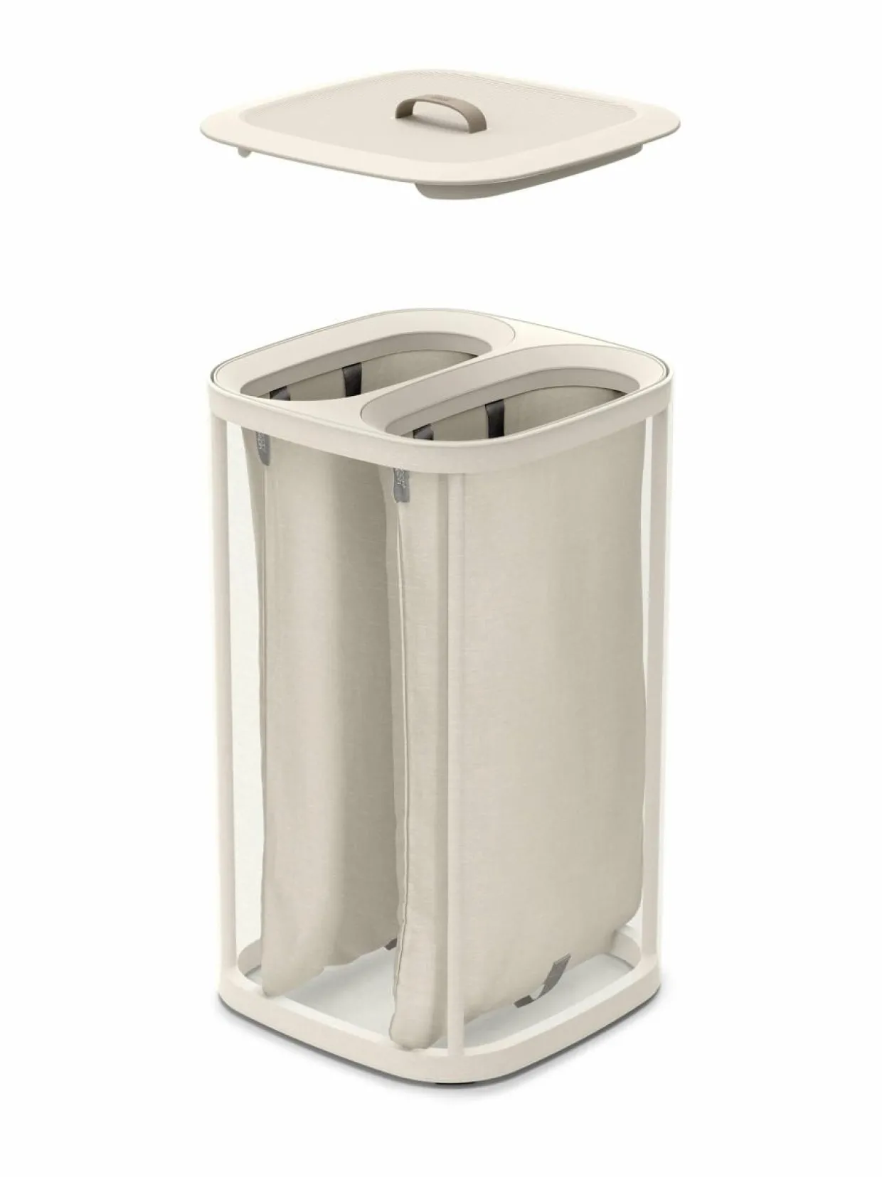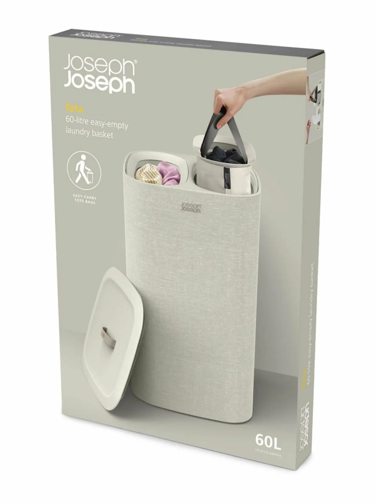 Tota sopii moneen tilaan ja sisustukseen. Tota- erotteleva pyykkikori helpottaa arkea erottelemalla vaalean ja tumman värisen pyykin omiin 30 litran lokeroihinsa. Pyykit kulkeutuvat kätevästi pyykkitupaan olalla kannettavista kantokahvoista. Pussin pohjassa oleva käytännöllinen apukahva helpottaa tyhjennystä. Tyhjät pyykkipussit asettuvat takaisin omiin lokeroihinsa vaivatta.