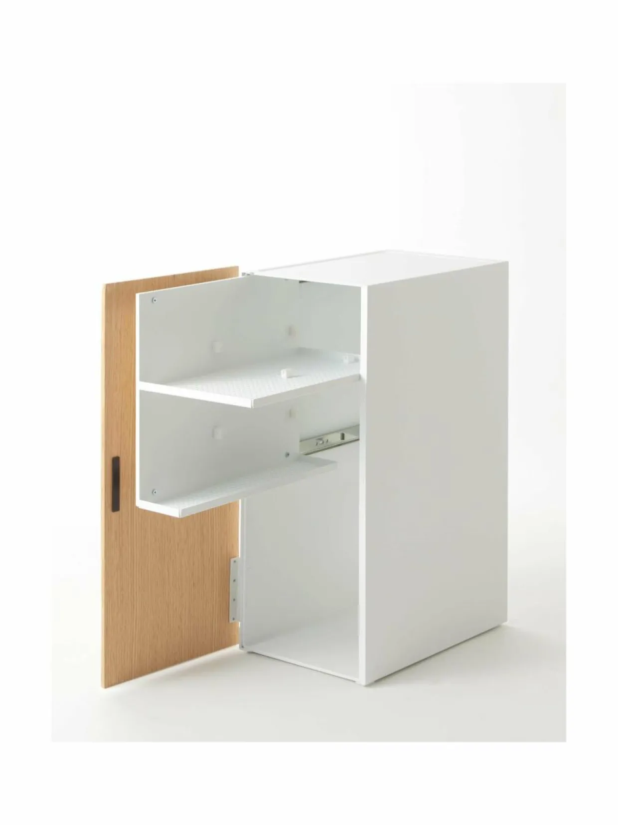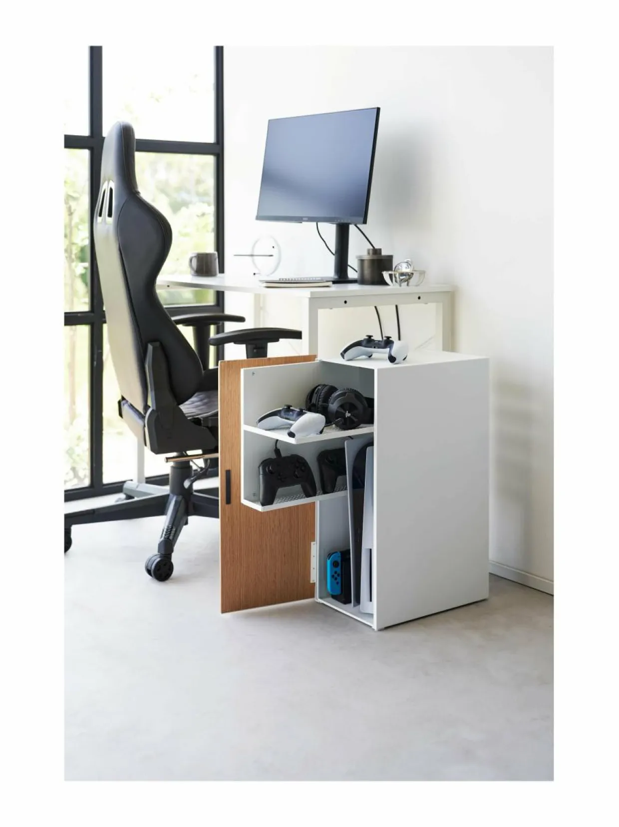 Tower-sarjan pelikonsolikaappi auttaa pitämään laitteet, ohjaimet, kuulokkeet ja muut pelivälineet järjestyksessä. Osittain avonainen takaseinä ehkäisee laitteiden ylikuumenemista, ja puuovi tekee ulkonäöstä tyylikkään. Kaapin sisällä on kaksi ulosvedettävää hyllyä: ylemmän hyllyn kantavuus 1,5 kg ja alemman 1 kg. Suunniteltu Japanissa.