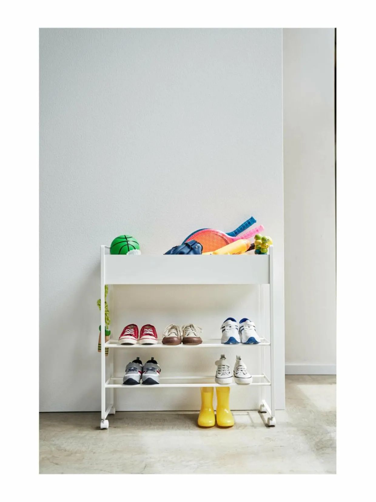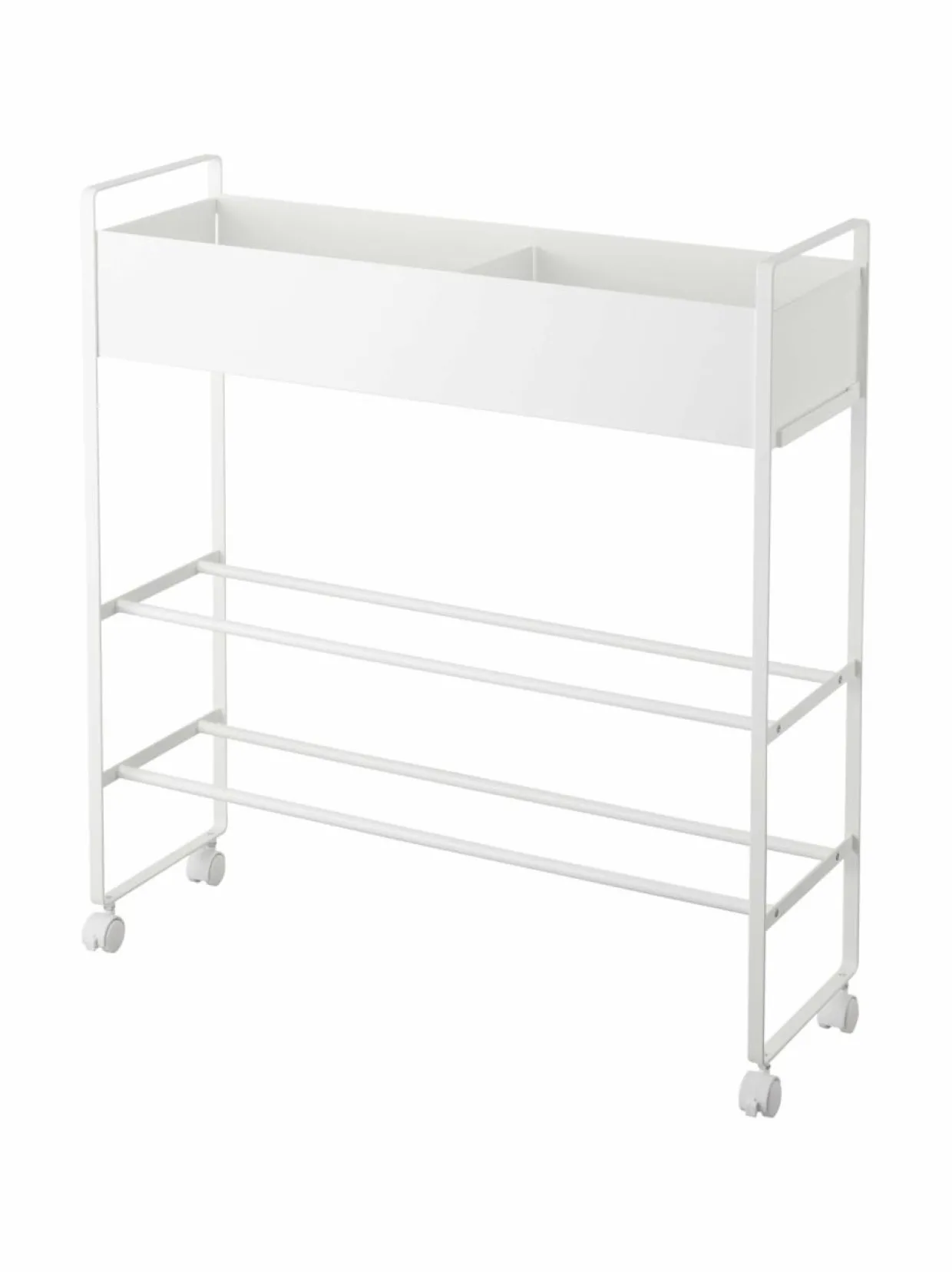 Yamazaki-merkin Tower-sarjan säilytyskärry on tyylikäs, tilava ja monikäyttöinen säilytyskaluste, joka sopii moneen tilaan aina lastenhuoneesta eteiseen.Yläosan laatikko on toimiva säilytyspaikka esim. käsineille, pipoille, leluille, palloille ja muille harrastusvälineille. Laatikossa on kätevä väliseinä, jonka sijaintia voi muuttaa magneettikiinnikkeiden ansiosta. Laatikon alapuolella on kaksi hyllytasoa, jotka sopivat erinomaisesti esimerkiksi kenkien säilyttämiseen.