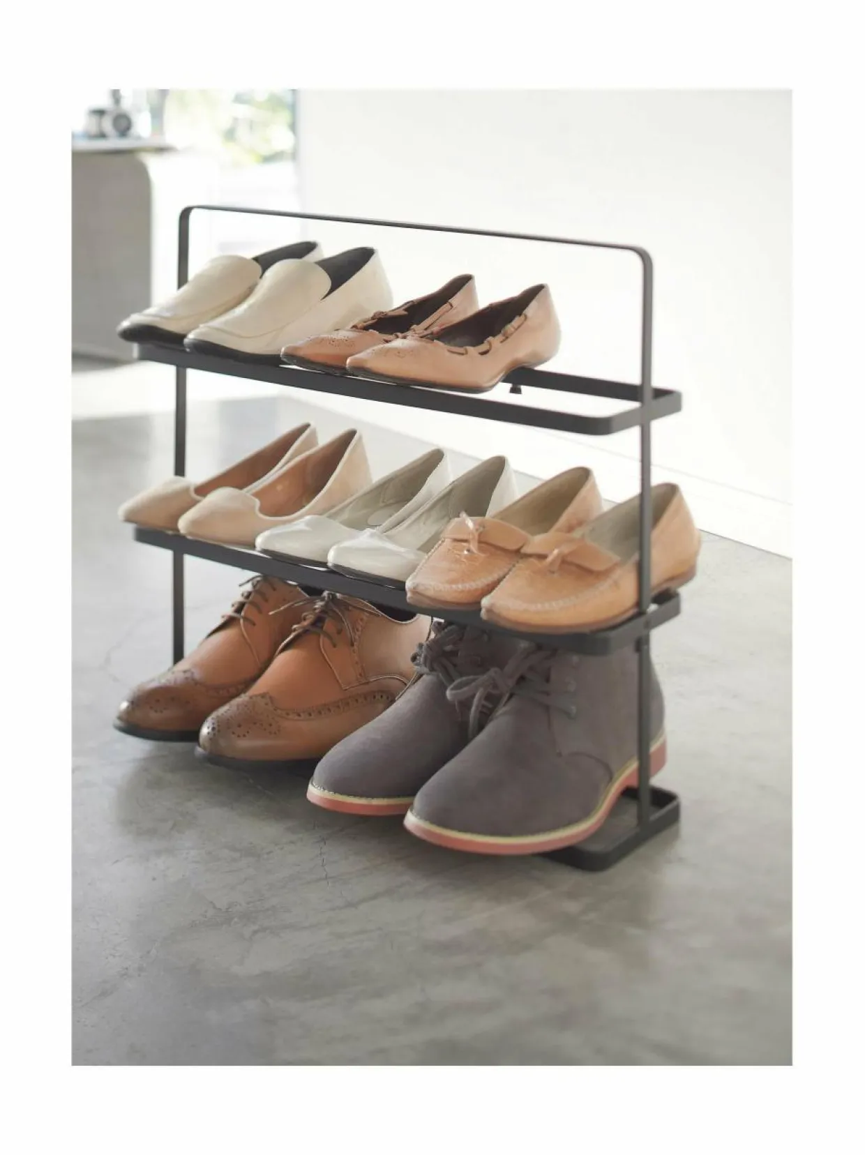 Teräsrunkoinen Yamazaki Tower Shoe Rack Wide -kenkähylly on rakenteeltaan siro, mutta tukeva. Kevyt teline on helppo nostaa ja siirtää paikasta toiseen. Kenkähyllyyn mahtuu kuusi paria kenkiä. Tuote on koottava. Suunniteltu Japanissa.