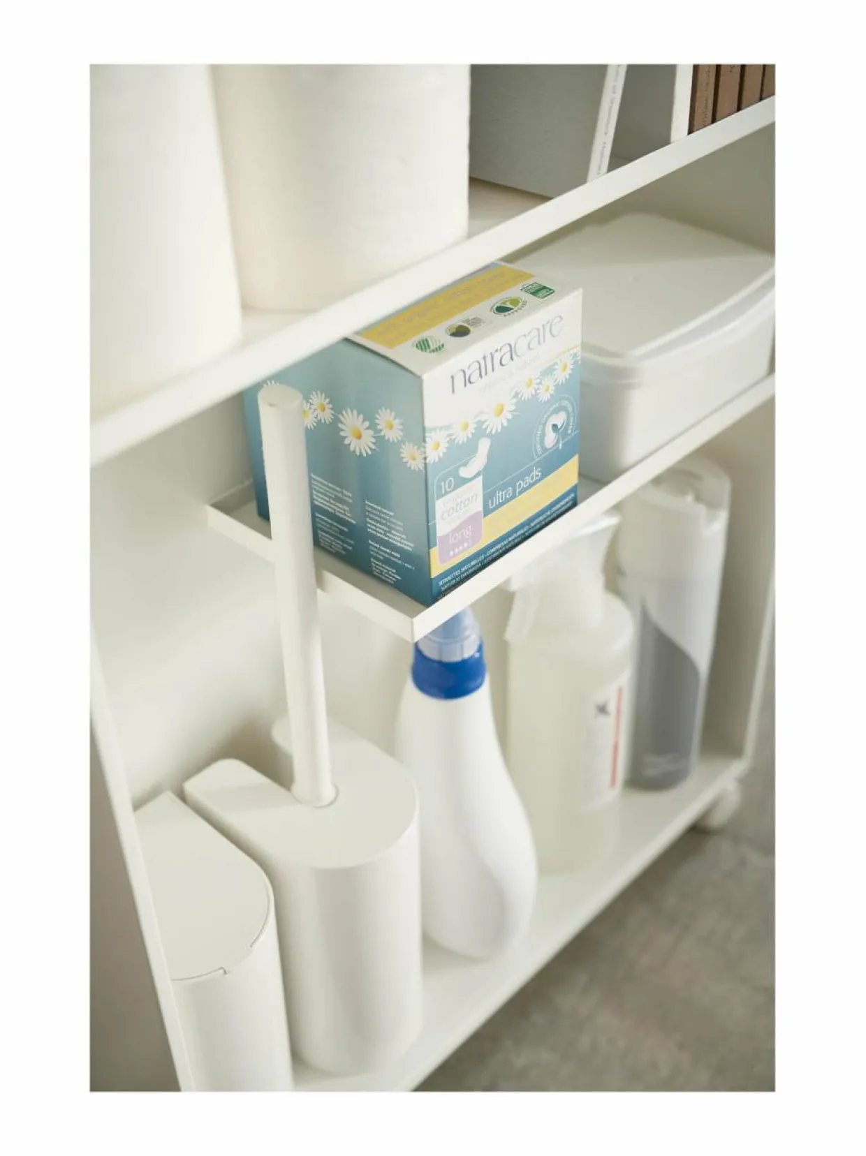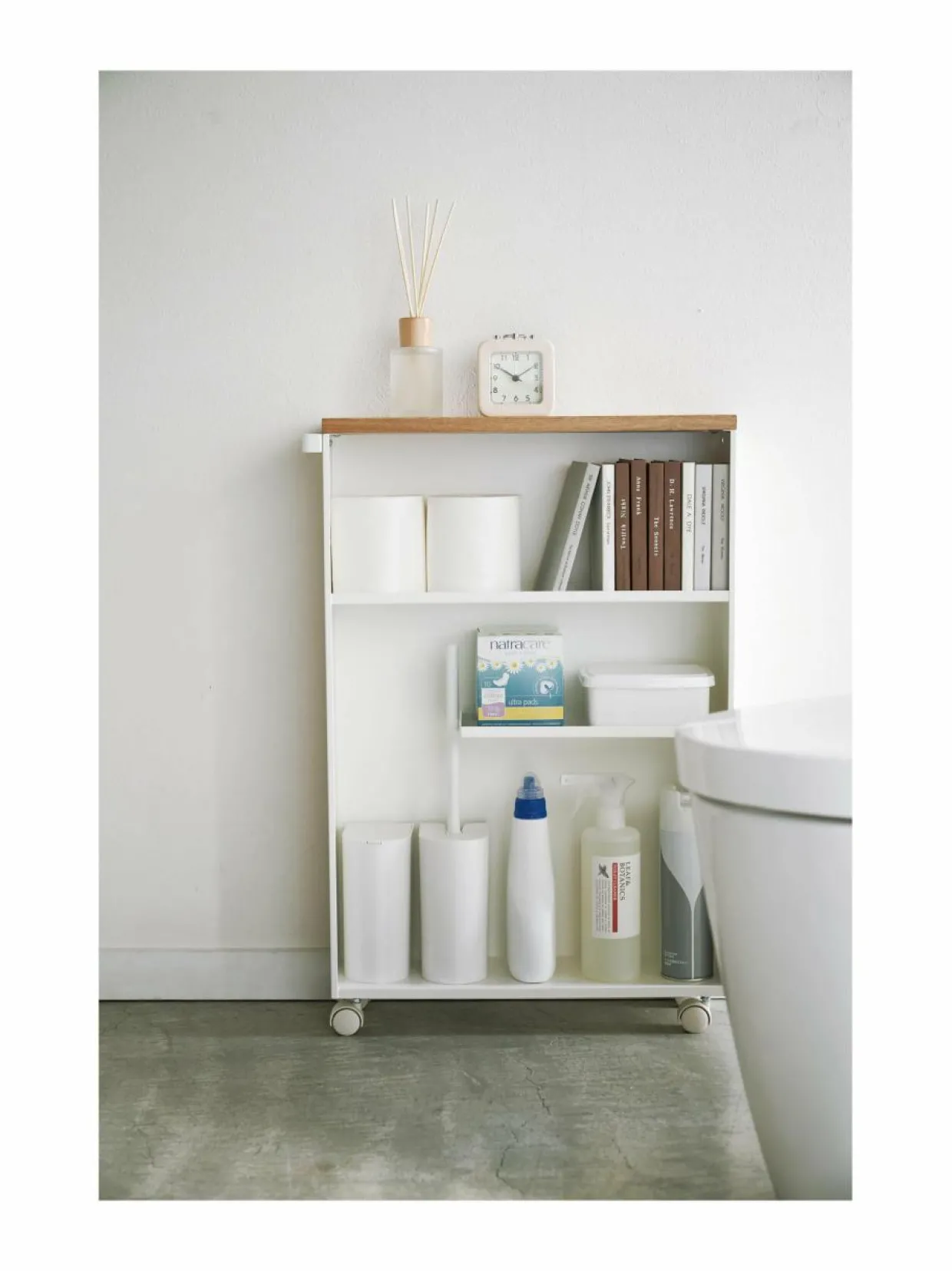 Yamazaki Tower Slim -kärryssä voi näppärästi säilyttää erilaisia kylpyhuoneen tarvikkeita kuten vessapapereita ja siivousaineita. Puisen kannen päälle voi asetella pieniä koriste-esineitä tai kauniita koruja. Modernin ja kapean designin ansiosta kärry mahtuu jopa pienempiinkin kylpyhuoneisiin.