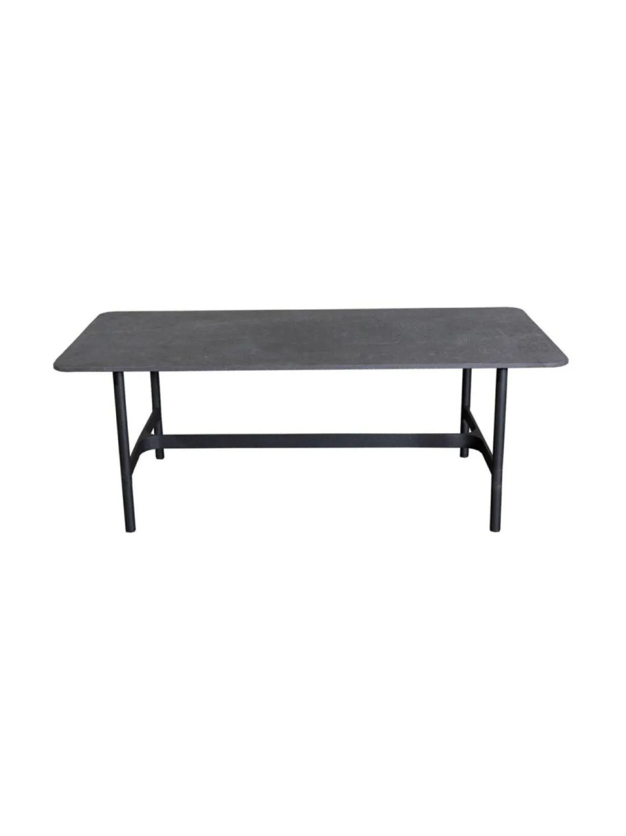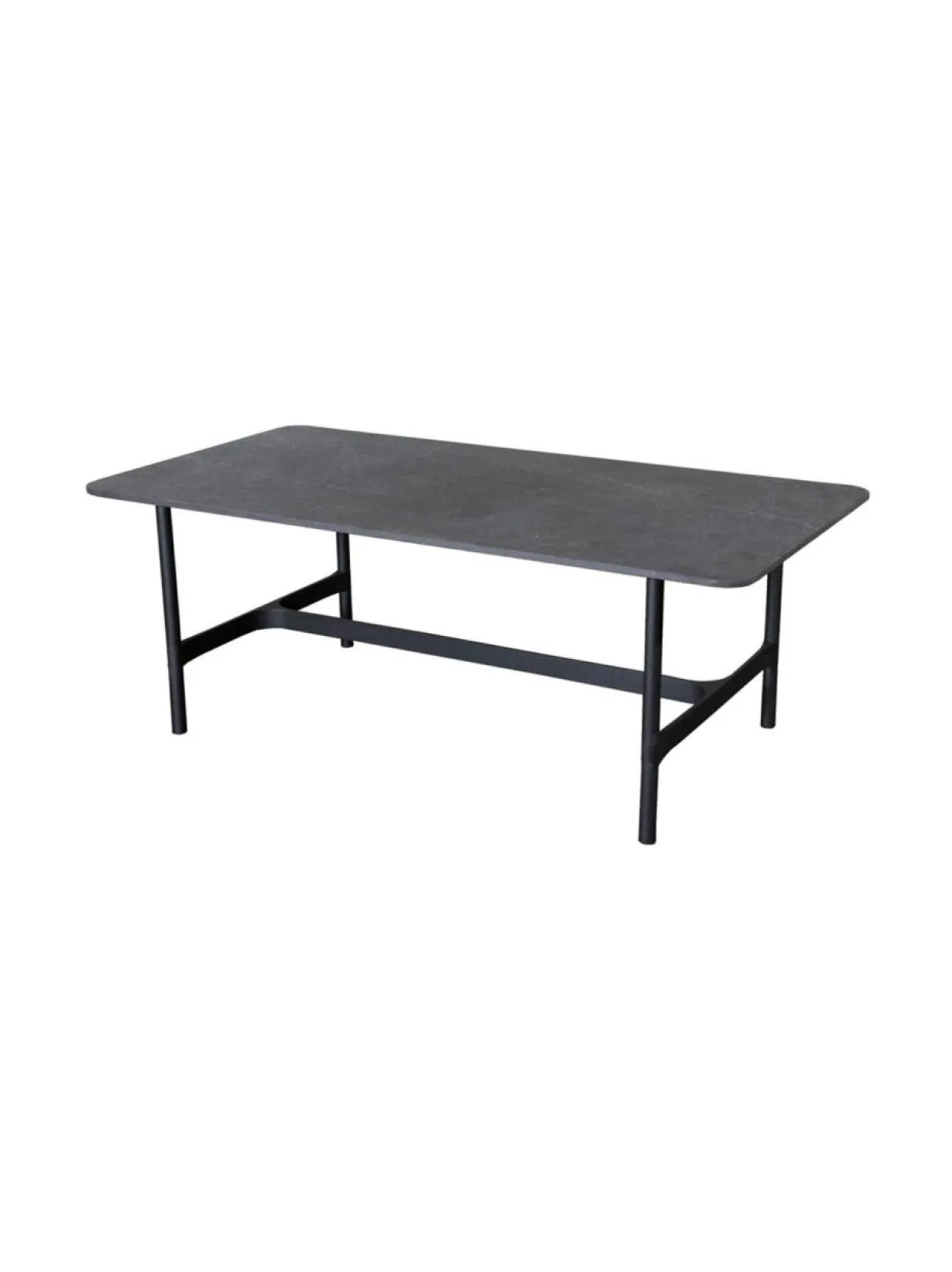Twist -sohvapöytä ulkokäyttöön. 120 cm lev x 60 cm syv, 42 cm kork. Tumman harmaa jauhemaalattu alumiinirunko, keraaminen kansi, musta fossiilikuviointi, pyöristetyt kulmat. Helppohoitoinen. Toimii yksin tai muiden Twist-sarjan pikkupöytien kanssa yhdistettynä.